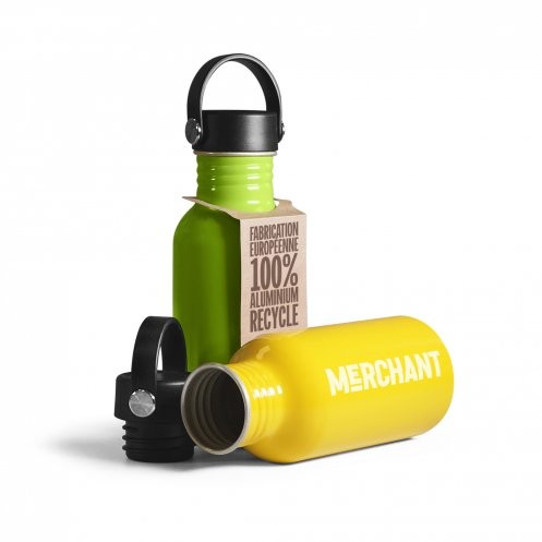 Bouteille 600ml en alumium recyclé et bouchon anse. Fabriqué en Espagne. Un marquage 1 couleur 1 position et frais techniques inclus.