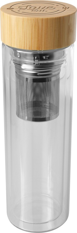 Bouteille d’eau en verre borosilicate à double paroi avec infuseur de thé et couvercle en bambou. Le bambou utilisé provient de sources durables, respectueuses de l’environnement et socialement responsables. Capacité : 400 ml. Livré dans un coffret en carton recyclé. Verre borosilicate. Fabriqué en Chine.