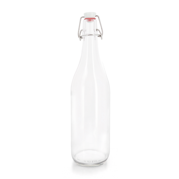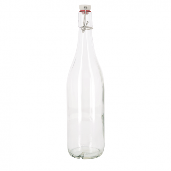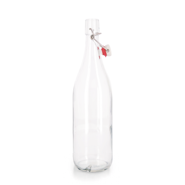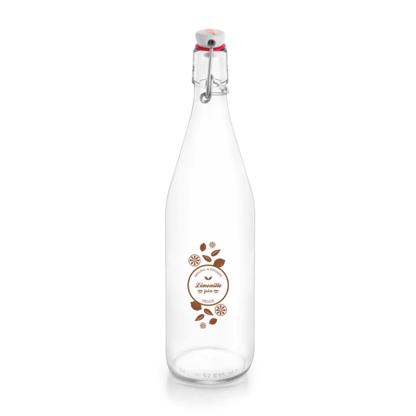 Bouteille à limonade 1 litre en verre, bouchon en céramique et fabriqué dans la Loire. Un marquage 1 couleur 1 position et frais techniques inclus.