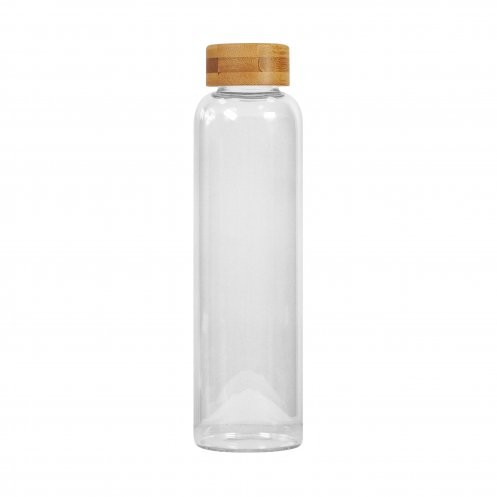 Bouteille 100% verre borosilicate avec bouchon en bambou, fourreau en feutre reyclé et livré sous boite carton. Fabriqué en Chine.