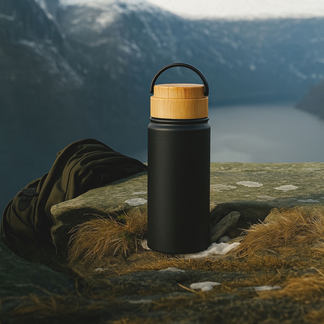 Bouteille 550ml double paroi, antifuite, système sous vide 100% acier inoxydable, couvercle en bambou et polypropylène.