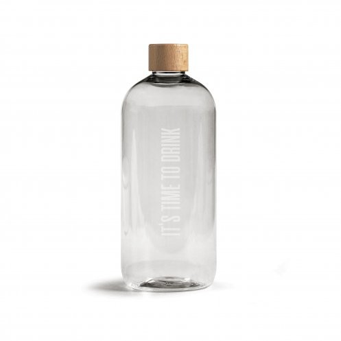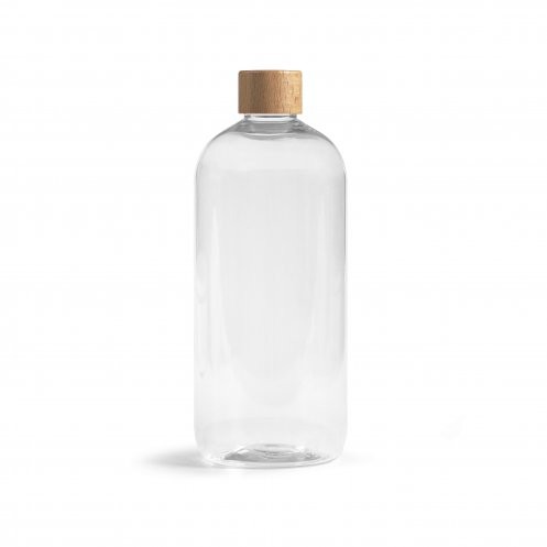 Bouteille 750ml 100% PET recyclé, hêtre, aluminium, bouchon à vis en bois d’hêtre et aluminium.