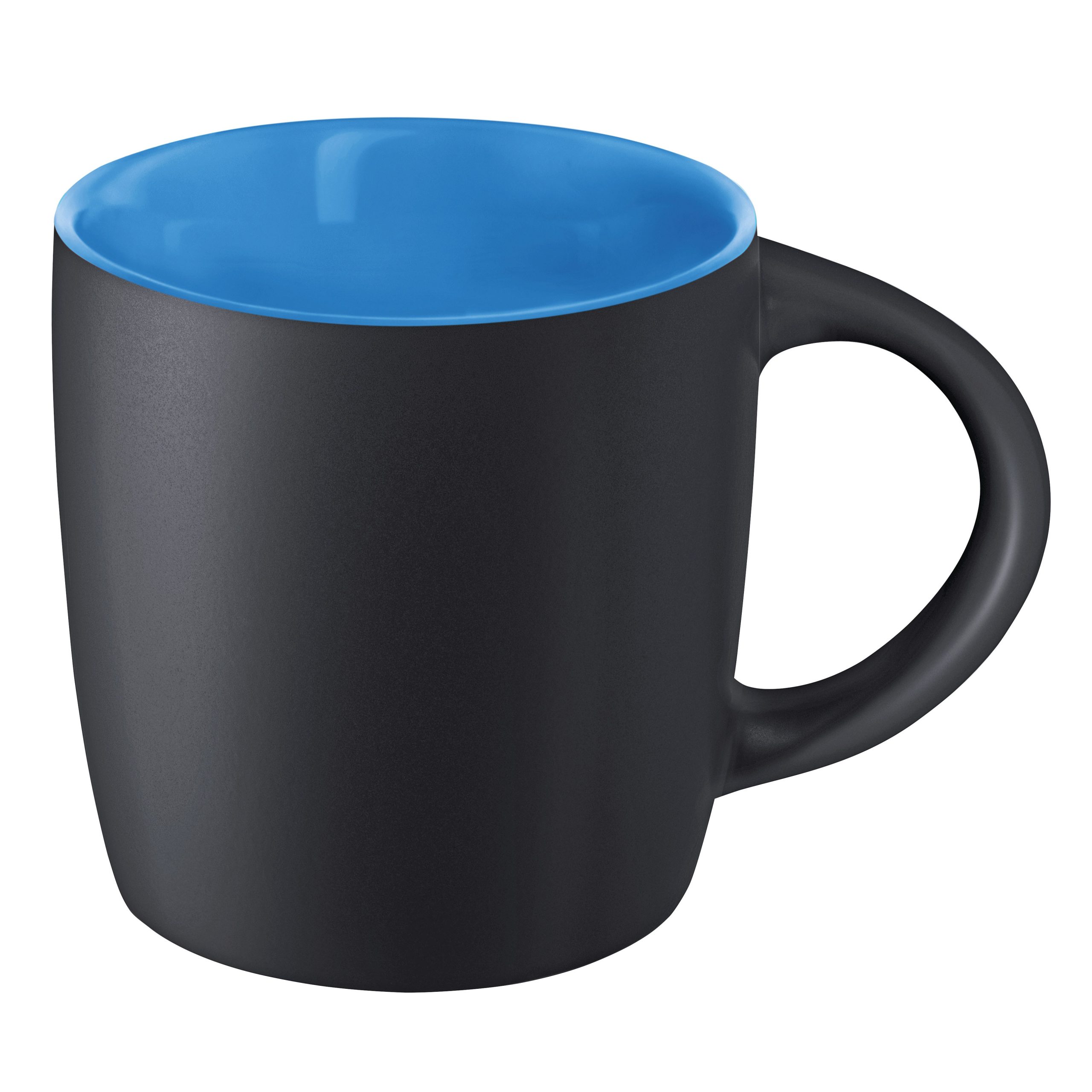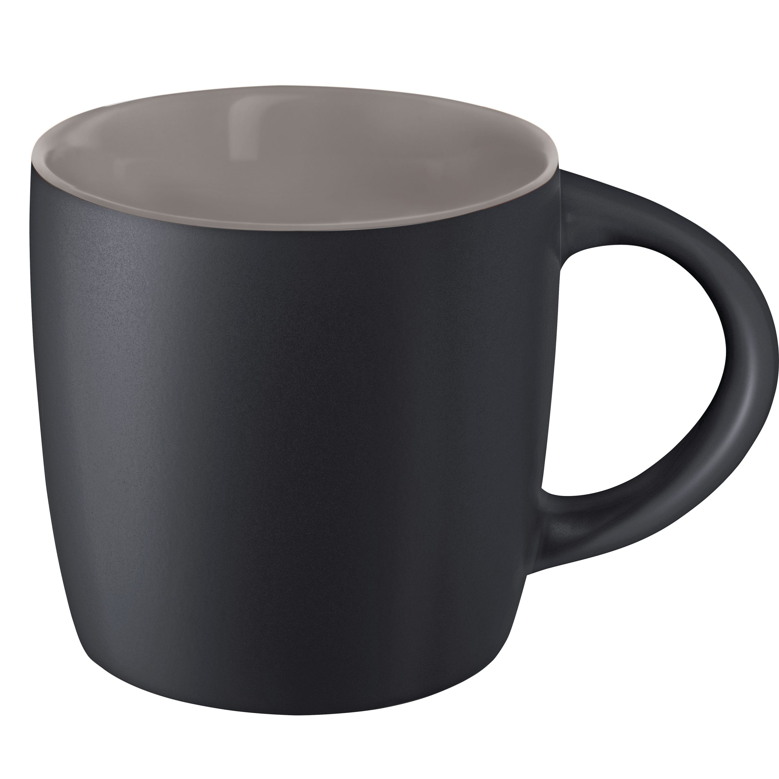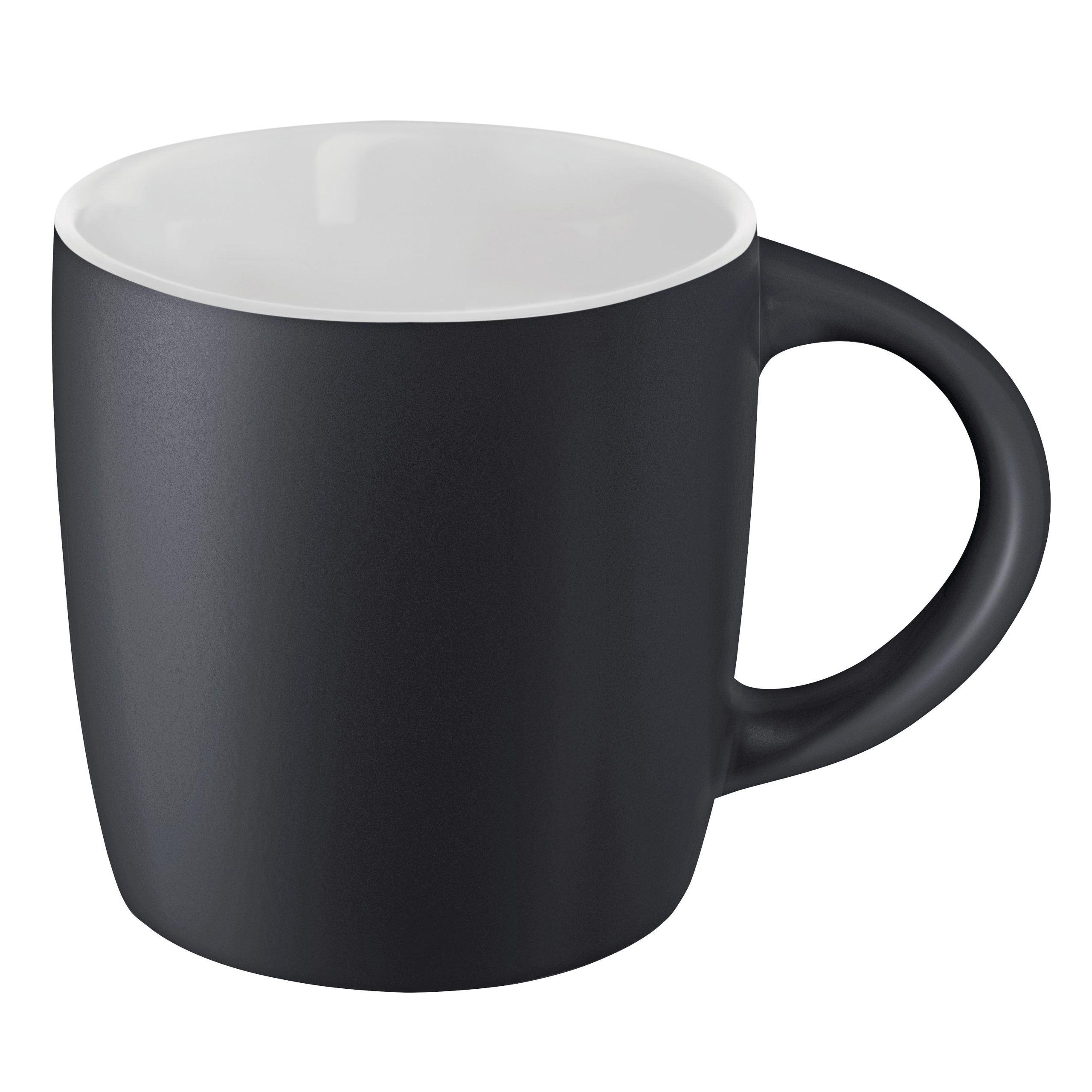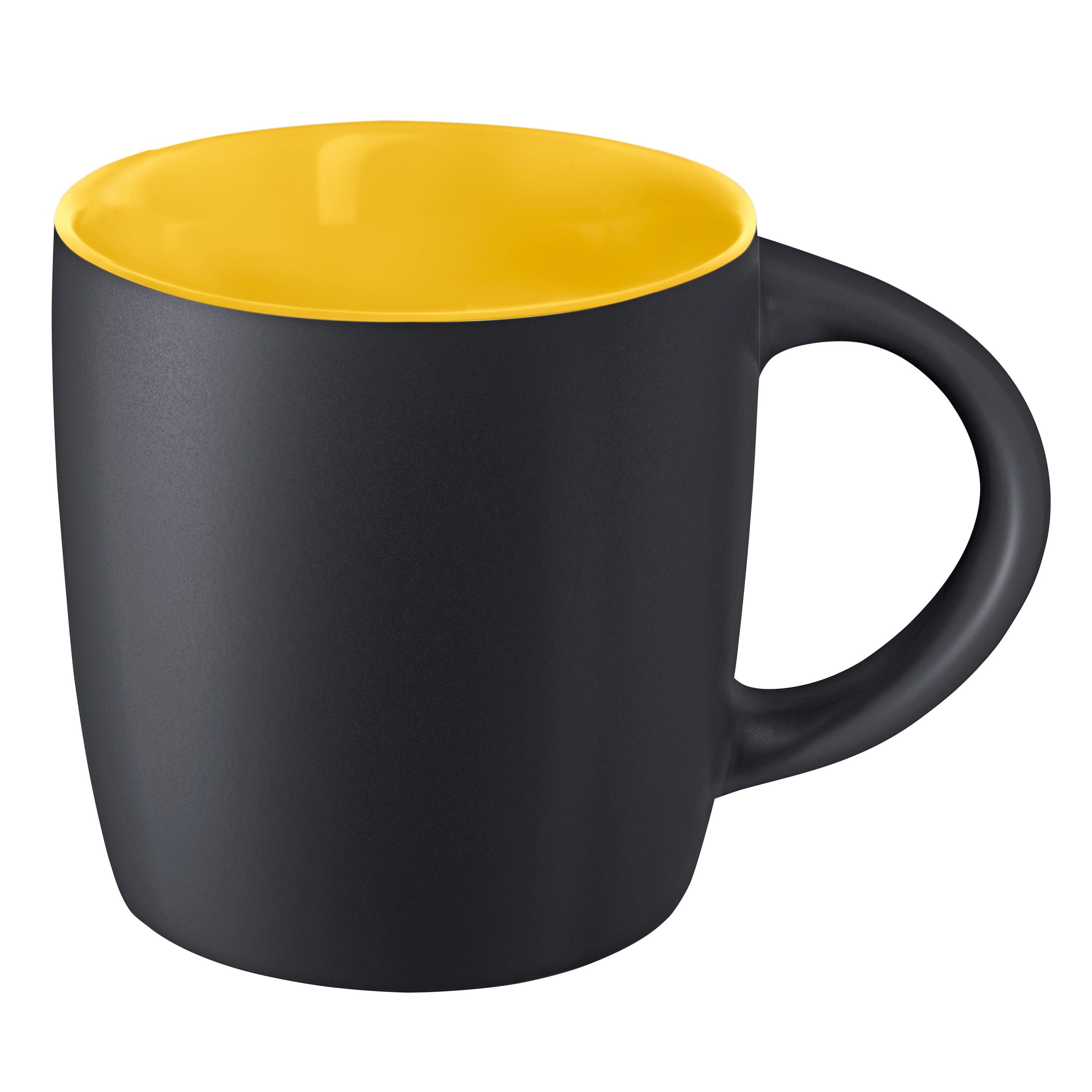 Mug 250ml en grès noir mat avec intérieur coloré, la classe naturelle de la couleur noire avec une note de couleur, conditionnement par carton de 36 pièces. Un marquage 1 couleur 1 position et frais techniques inclus.