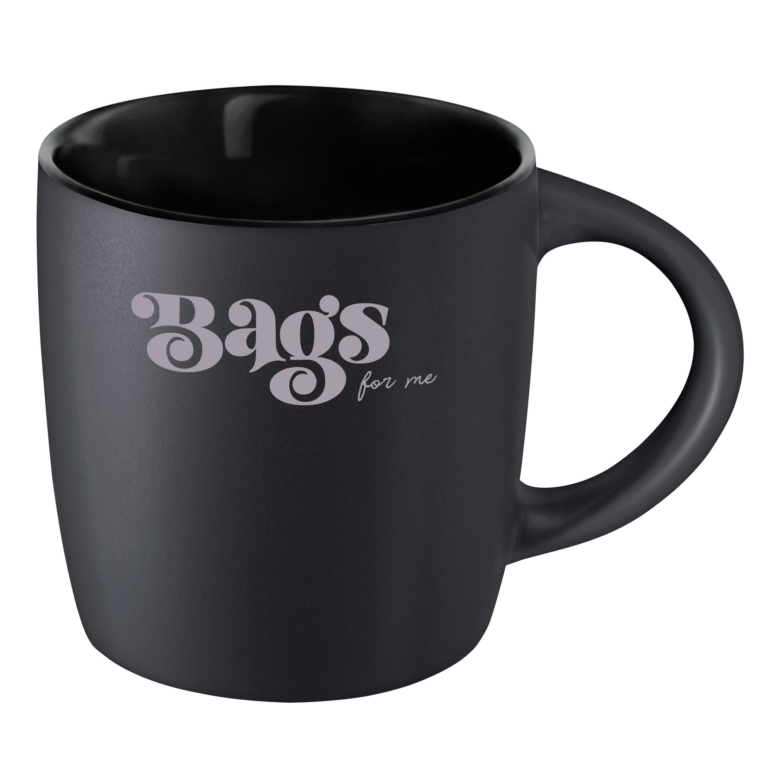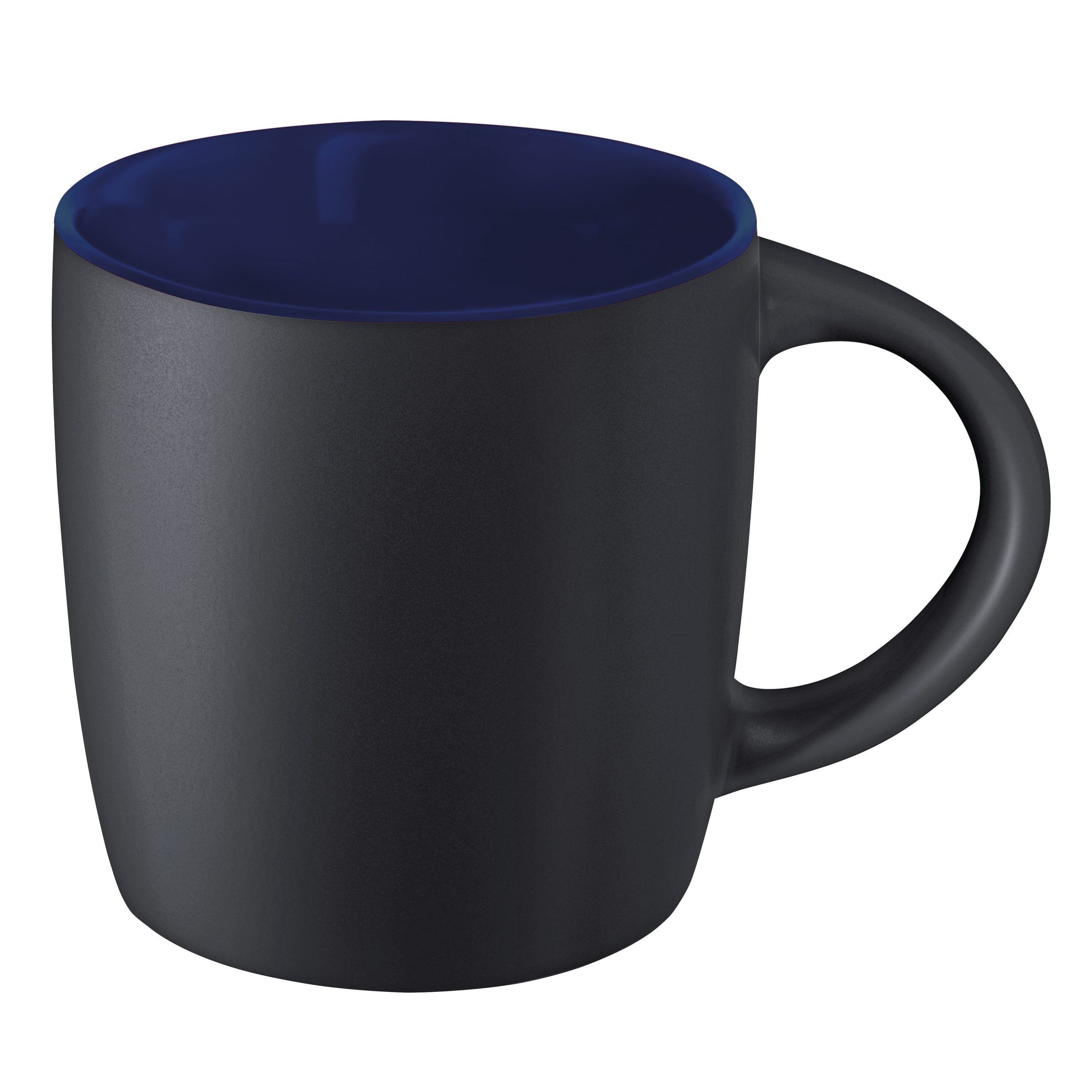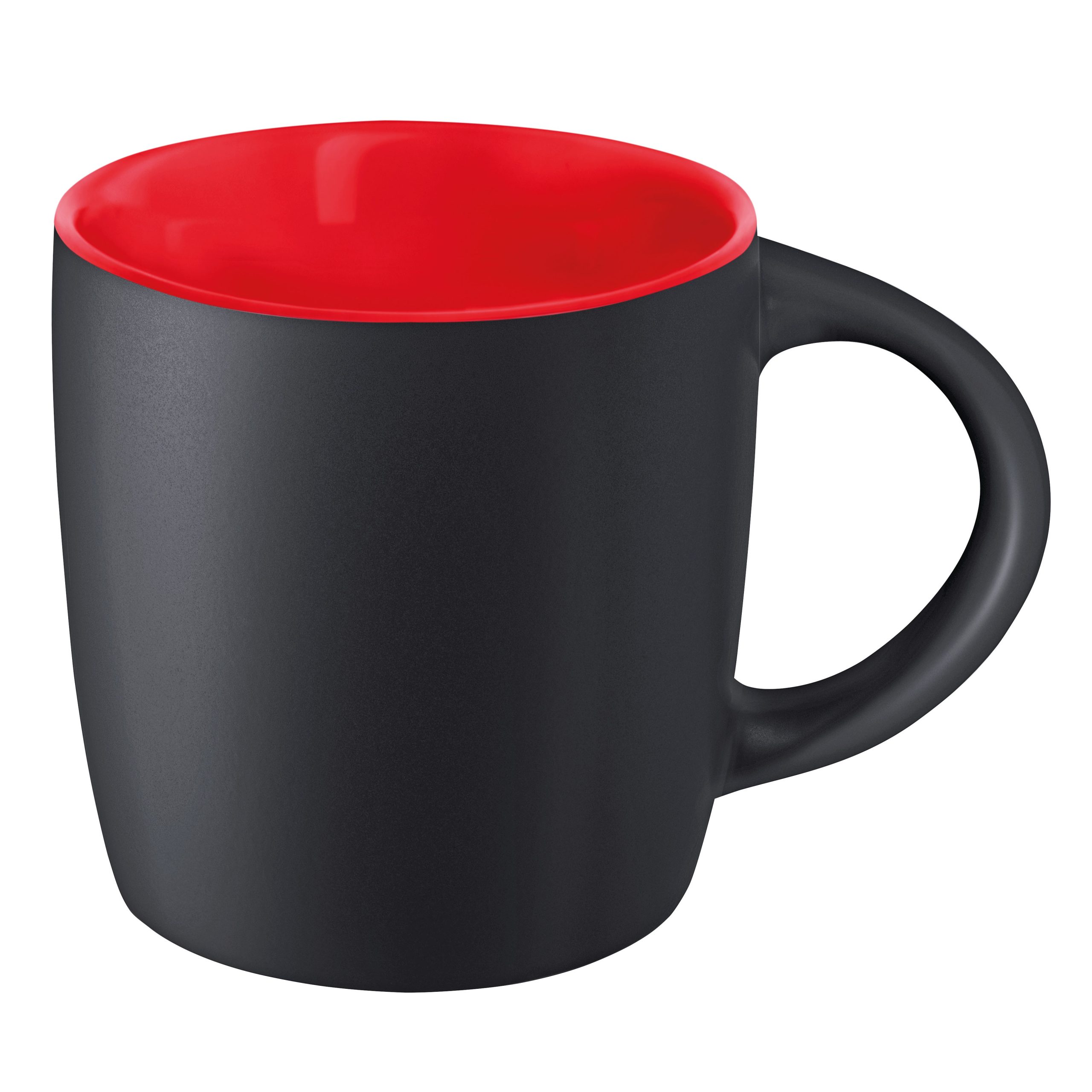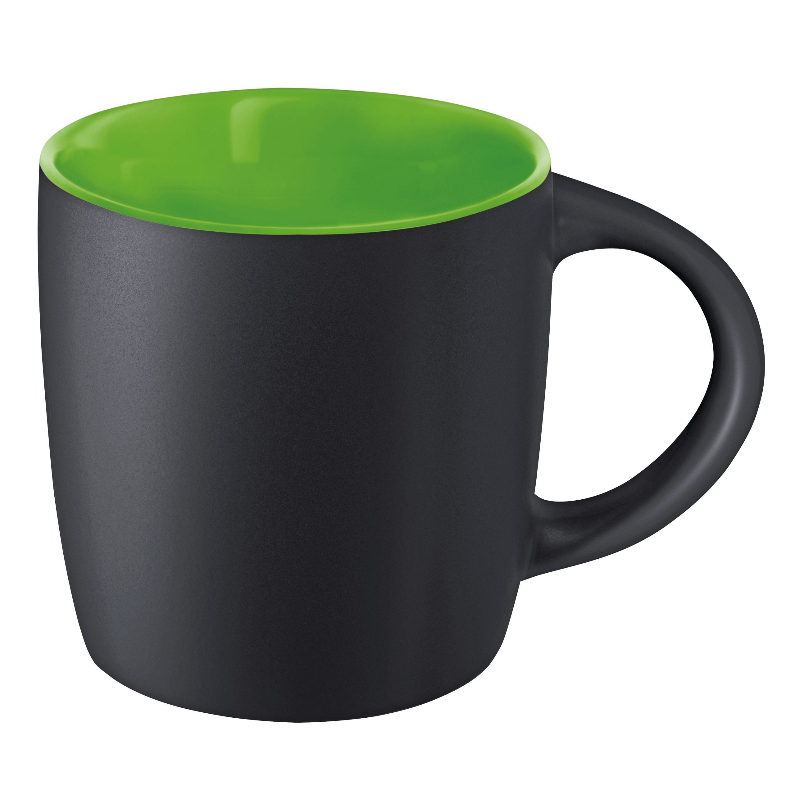 Mug 250ml en grès noir mat avec intérieur coloré, la classe naturelle de la couleur noire avec une note de couleur, conditionnement par carton de 36 pièces. Un marquage 1 couleur 1 position et frais techniques inclus.