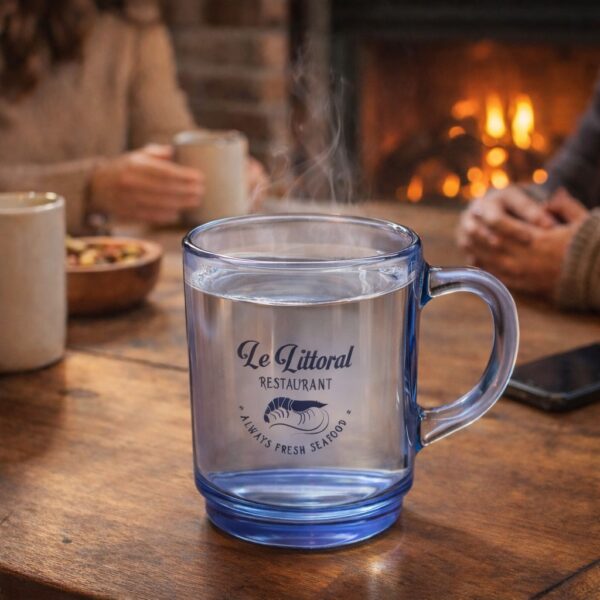 Mug 260ml en verre trempé. Résistance aux chocs et aux ébréchures des lavages intensifs, passe au micro-ondes. Livré dans une boite kraft antichocs. Un marquage 1 couleur 1 position et frais techniques inclus.
