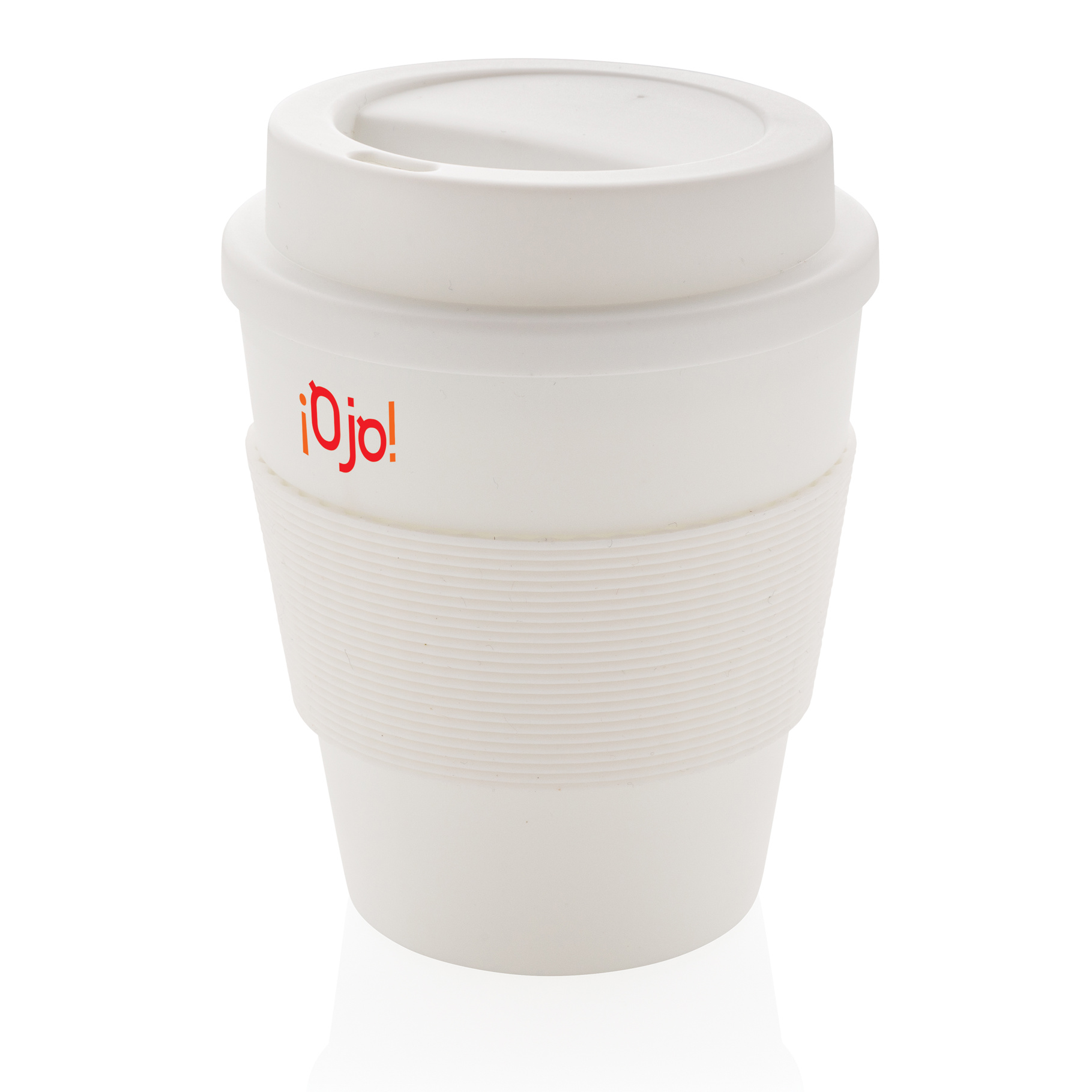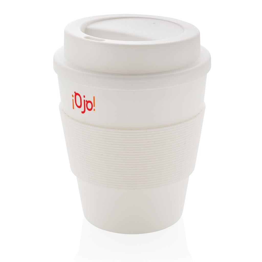 Mug 350ml en PP recyclable, couvercle à vis et bandeau de protection en silicone. Convient pour les boissons froides et les boissons chaudes jusqu’à 100 degrés. Passe au lave-vaisselle et au micro-ondes. Fabriqué en Chine et imprimé en Europe.