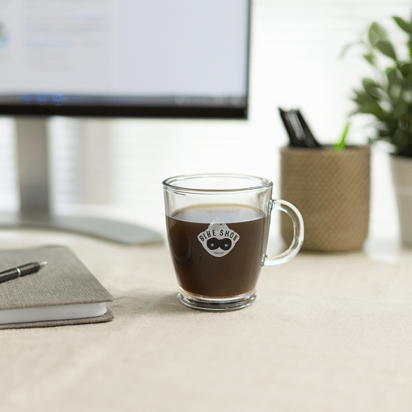 Mug 380ml en verre et livré sous boite carton.
