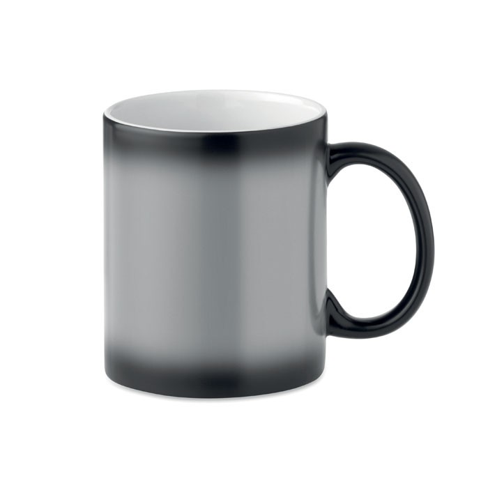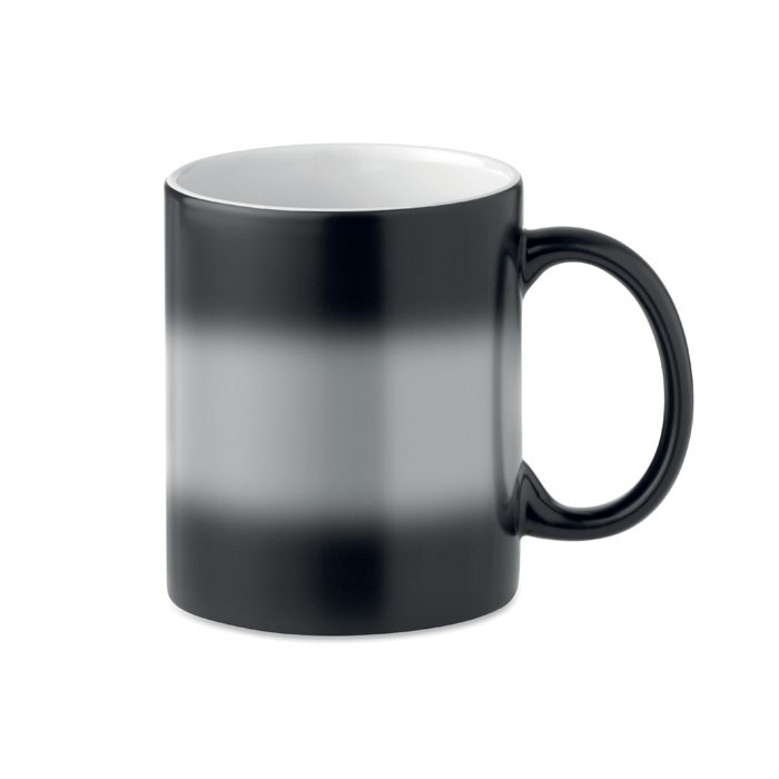 Mug en céramique de 300 ml avec revêtement spécial pour sublimation. La tasse change de couleur pour votre impression personnalisée en y versant du liquide à 50°C (au moins). Emballage individuel dans une boîte en carton blanc. Article non résistant au lave-vaisselle.