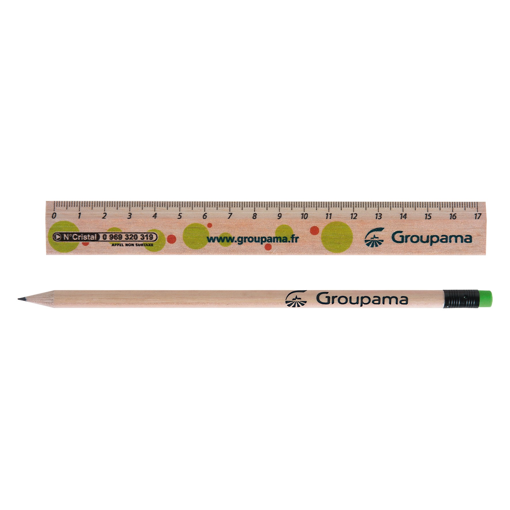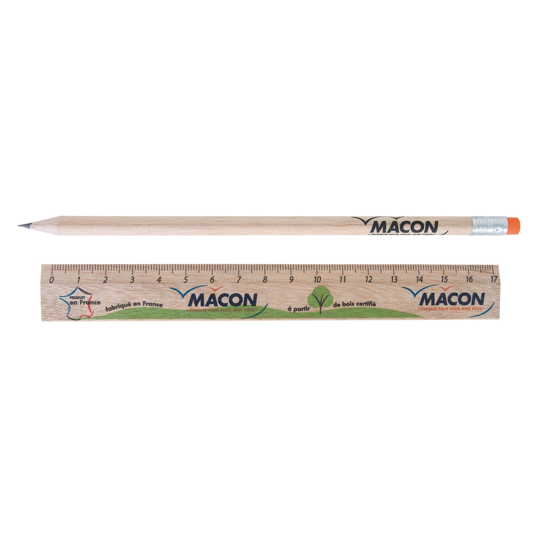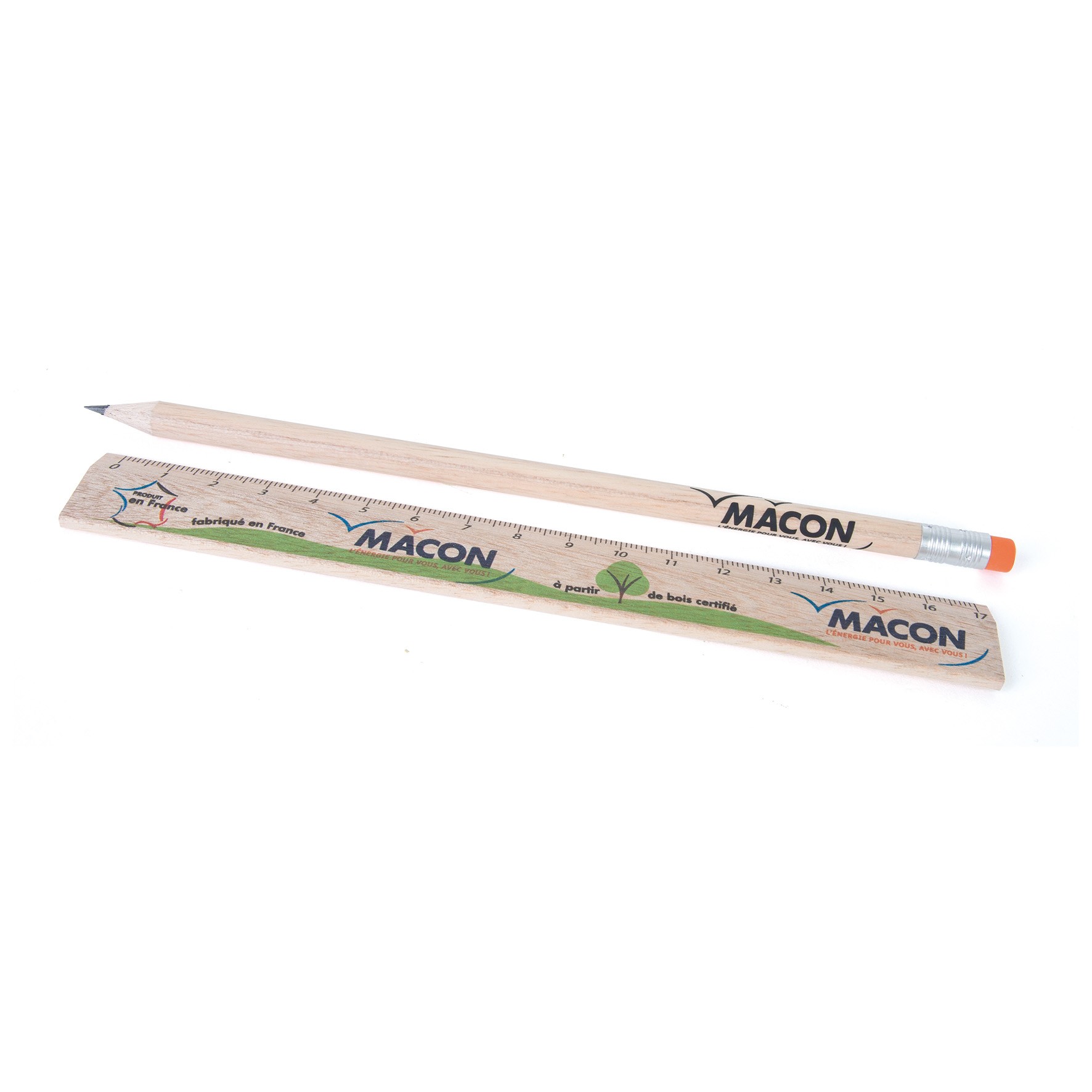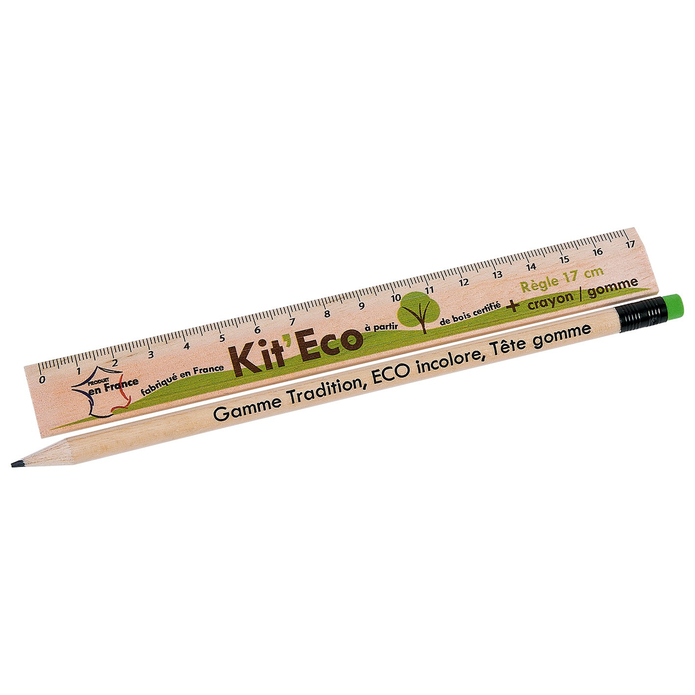 Règle de 17 cm sans avec crayon ECO vernis incolore, livret sous sachet polypro. Un marquage quadri sur la règle et sur le crayon et frais techniques inclus.