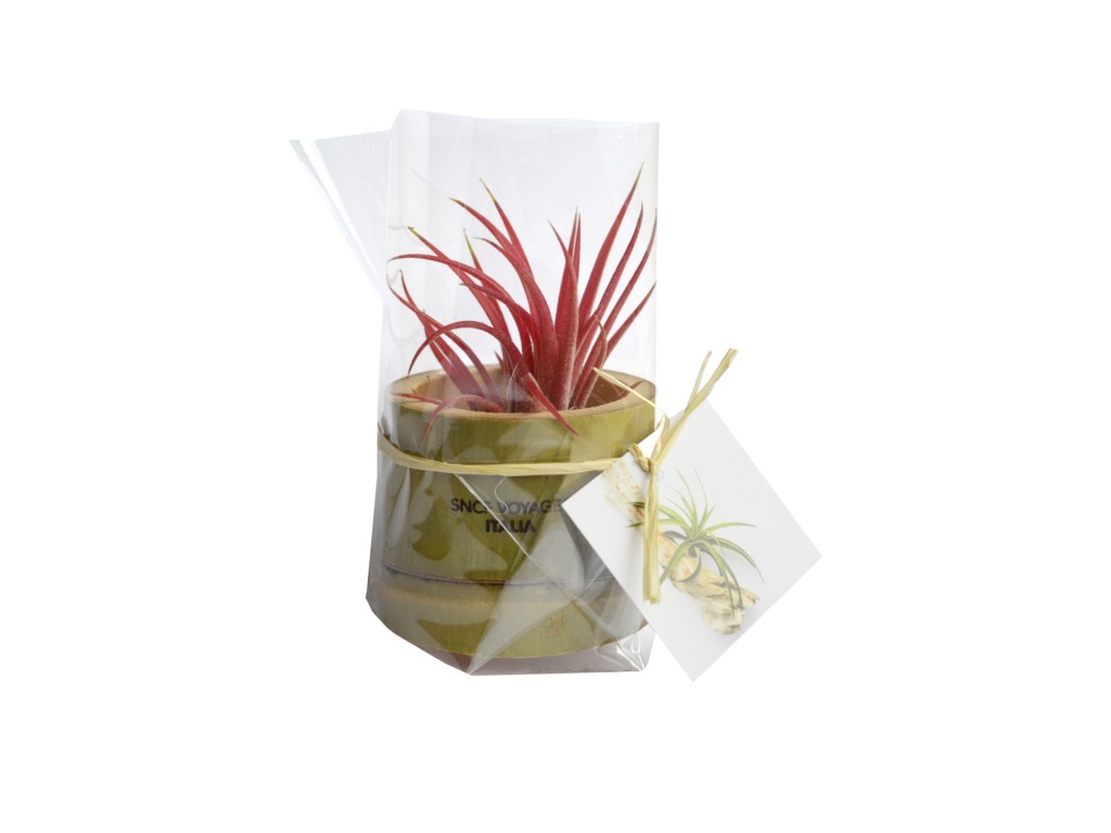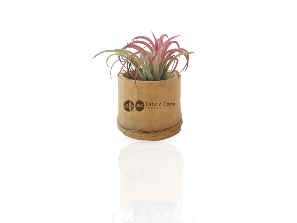 Ce petit pot en bambou naturel renferme un tillandsia, plante aérienne ne nécessitant pas de terre, facile d’entretien. Objet publicitaire original, il s’invite sur les bureaux ou comptoirs pour prolonger la visibilité d’un message tout en apportant une touche végétale valorisante, en phase avec une communication RSE. le kit comprend : 1 Pot bambou Format : Ø50 mm x H55 mm + 1 Etiquette en papier 350 gr/m² Format : 40×40 mm + 1 Tillandsia + 1 Papier fleuriste + raphia. Assemblé en France avec des matières venant d’Europe. Un marquage quadri sur étiquette adhésif (hors frais techniques, possibilité de gravure laser sur demande)