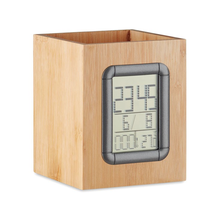 PORTE STYLOS EN BAMBOU AVEC CALENDRIER NUMERIQUE, REVEIL, THERMOMETRE MANILA