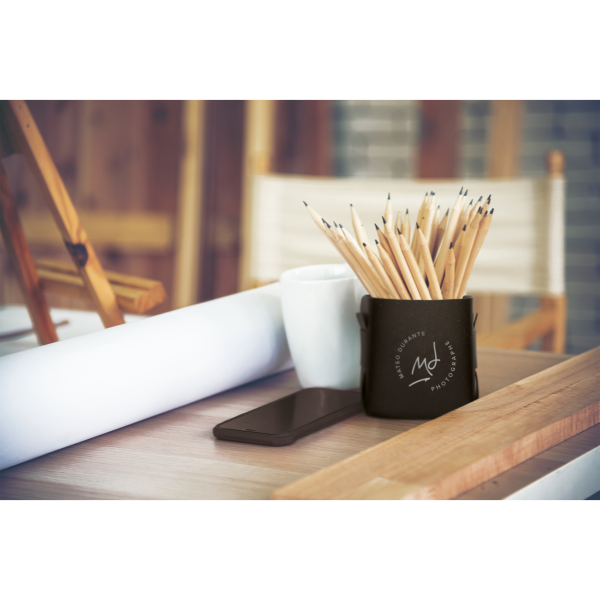 Pot à crayon en synderme, à monter soi-même en synderme (cuir reconstitué d’épaisseur 1 mm). Un marquage 1 couleur 1 position et frais techniques inclus.