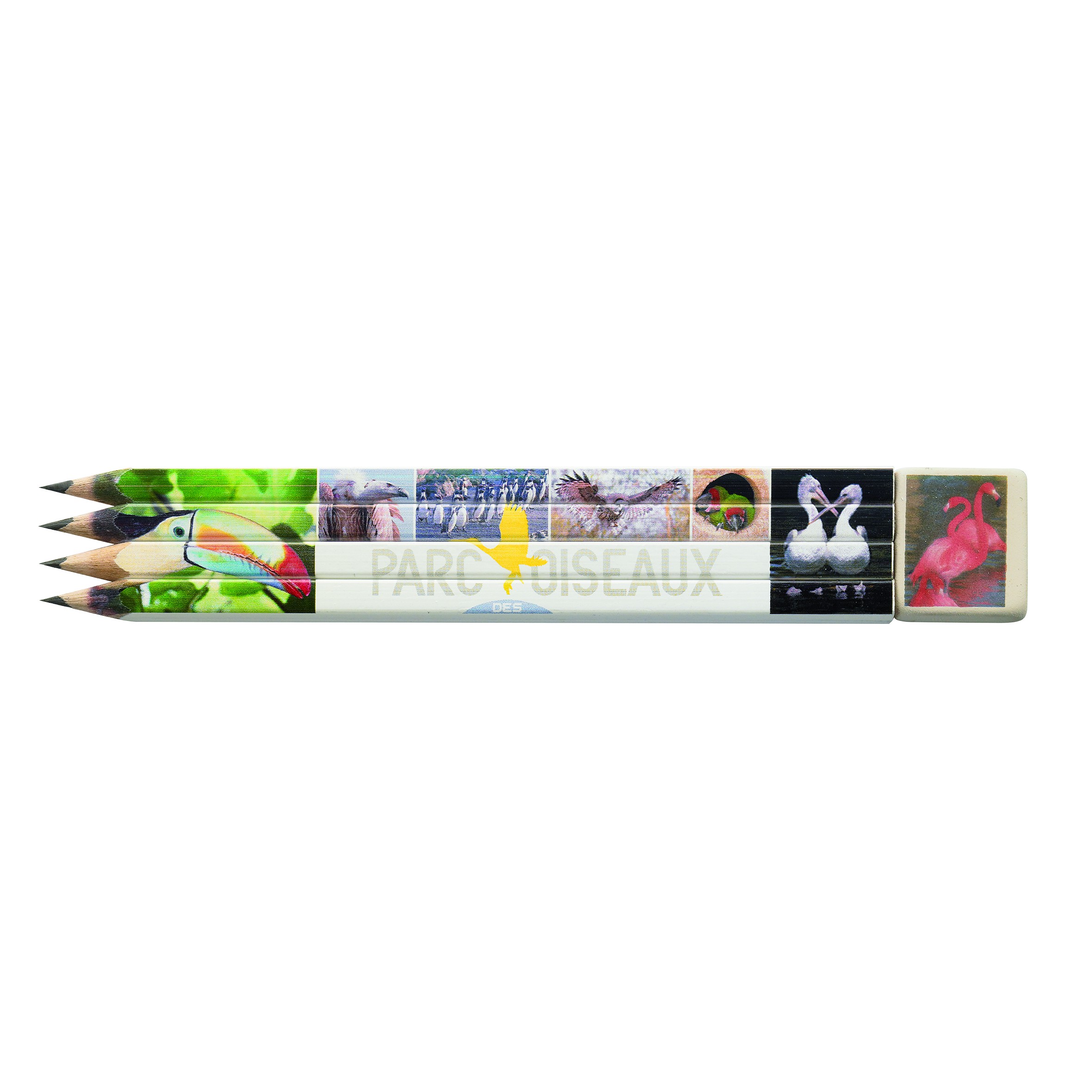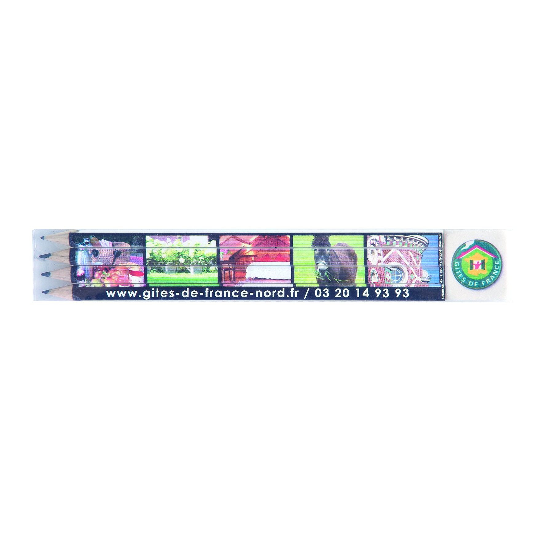 Set de 4 crayons carrés ECO avec tête coupée, vernis blanc + gomme dans un étui polypropylène. Fabriqué en France. Un marquage quadri recto sur les 4 crayons + gomme et frais techniques inclus.