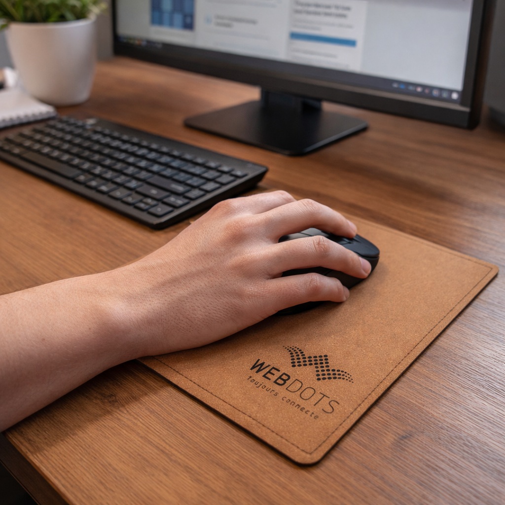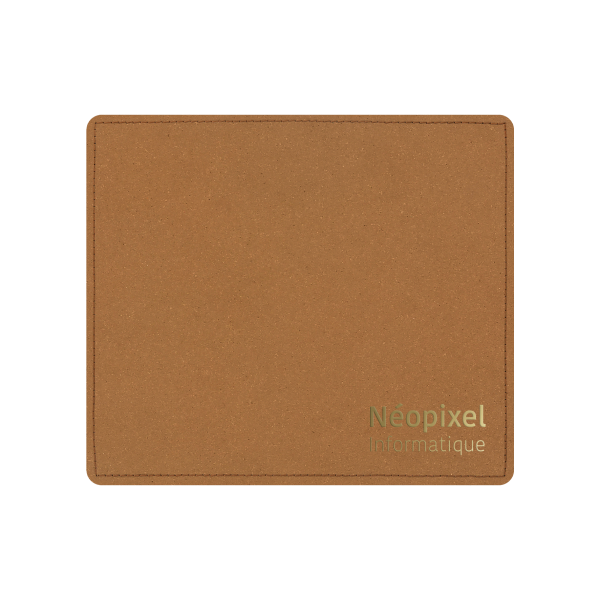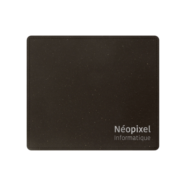 Tapis de souris en synderme (cuir reconstitué d’épaisseur 1 mm) finition piqûre maroquinerie et fabriqué en France. Un marquage 1 couleur 1 position et frais techniques inclus (possibilité de marquage à chaud ou en creux sur demande).
