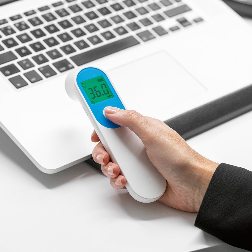 Thermomètre infrarouge numérique sans contact. Thermomètre ABS avec 2 piles AAA incluses. Comprend un capteur de haute précision qui vous permet de mesurer la température en seulement 3 secondes. Produit classé comme dispositif médical de classe IIa selon la directive 93/42/CEE. Permet de mesurer la température corporelle et la température de surface. Appareil avec mémoire sur les 20 dernières mesures. Écran LCD rétro-éclairé, avec indication sonore lorsque la mesure de température est terminée. Unités de température: échelle Celsius (° C) et échelle Fahrenheit (° F). Plage de mesure de la température corporelle: 32,0°C-43,0°C (89,6°F-109,4°F). Plage de mesure de température sur les surfaces: 5,0°C-95,0°C (41,0°F-203,0°F). Livré sous boite.