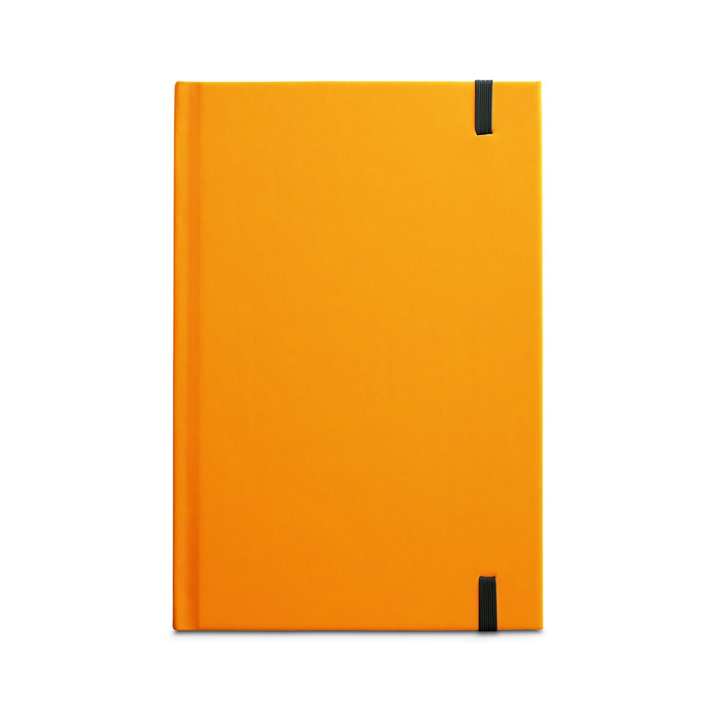 Bloc-notes A5 à couverture rigide fluorescente en PU avec 192 pages lignées blanches et contours noir, ruban marque-page et élastique.
