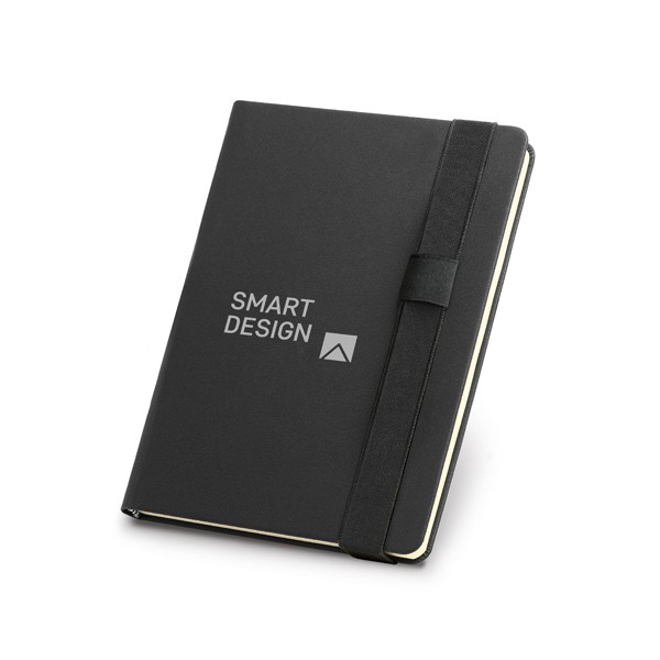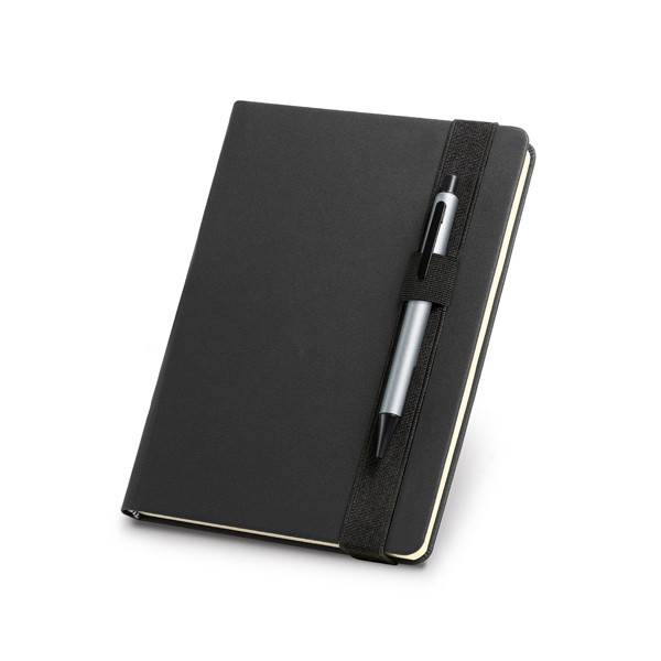 Bloc-notes A5 avec couverture rigide en PU. Ce bloc-notes comporte 280 pages ivoires unies (70 g/m²), fabriqué à partir de matériaux certifiés FSC™ et d’autres matériaux certifiés, un porte-stylo (stylo non inclus) et un élastique. Livré dans une pochette non tissée. Fabriqué en Chine.