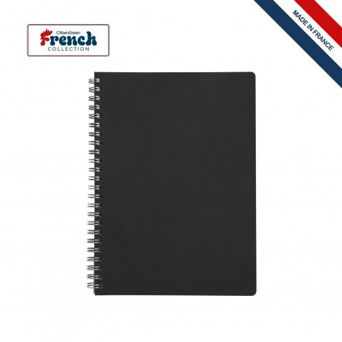 Cahier à spirale A5 avec couverture souple en cuir recyclé lisse 1mm; coins arrondis. 80 feuilles en papier recyclé 80g/m²; sans impression; coins droits et spirale métal argent grand côté. Fabriqué en France.