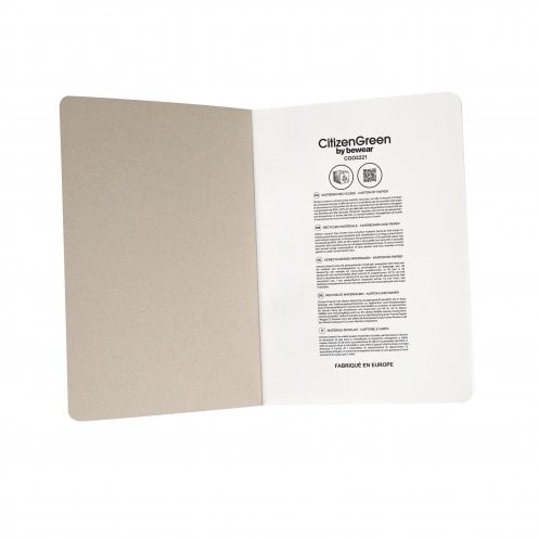 Carnet A5 avec couverture souple en papier et cuir 250gr (provenant des déchets de fabrication), 80 feuilles en papier blanc lignées recto. Papier 100% issu des forêts gérées durablement, coins arrondis et dos carré collé avec bande de papier.