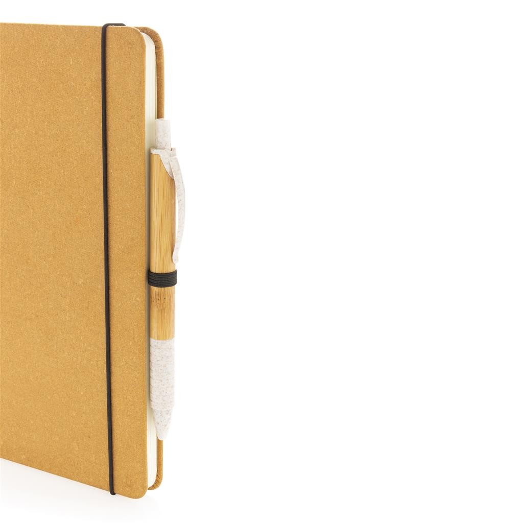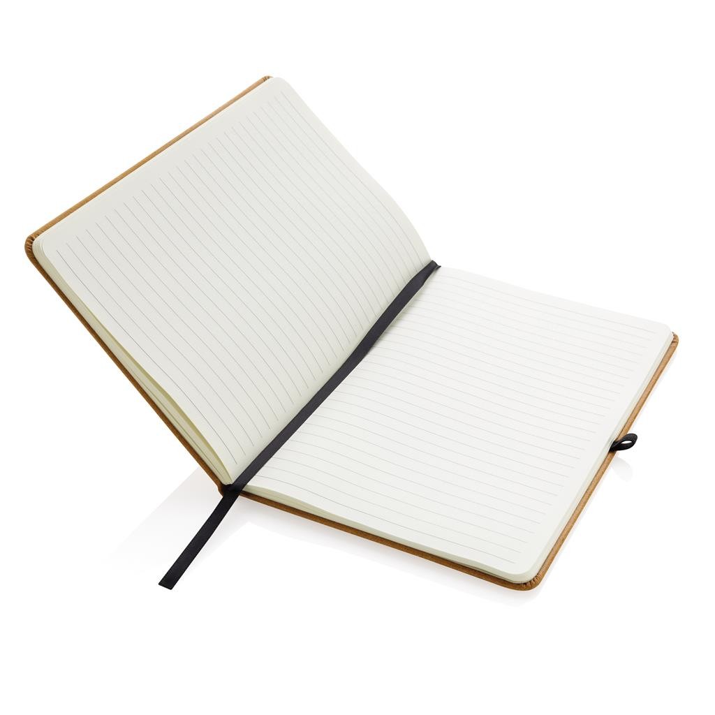 Carnet A5 en cuir recyclé. Élégant et bien fini avec 80 feuilles/160 pages de 70 g/m2 de papier recyclé ligné de couleur blanche, un élastique vertical et un passant stylo.