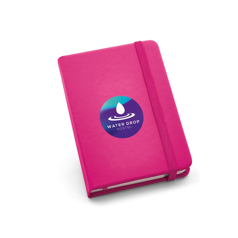 Bloc-notes de poche avec 160 pages non lignées, couverture rigide en simili cuir, bande de séparation et élastique.