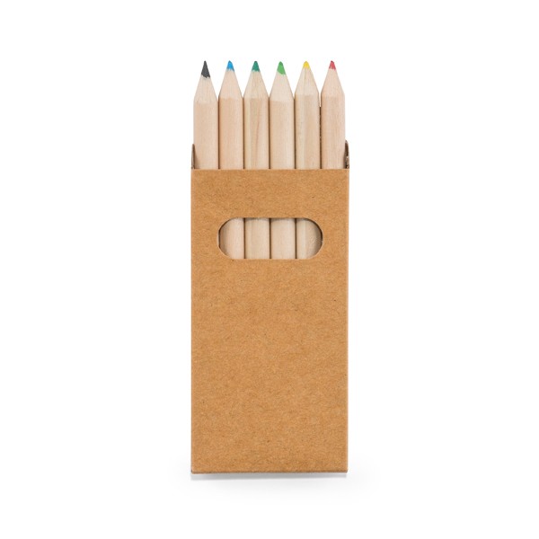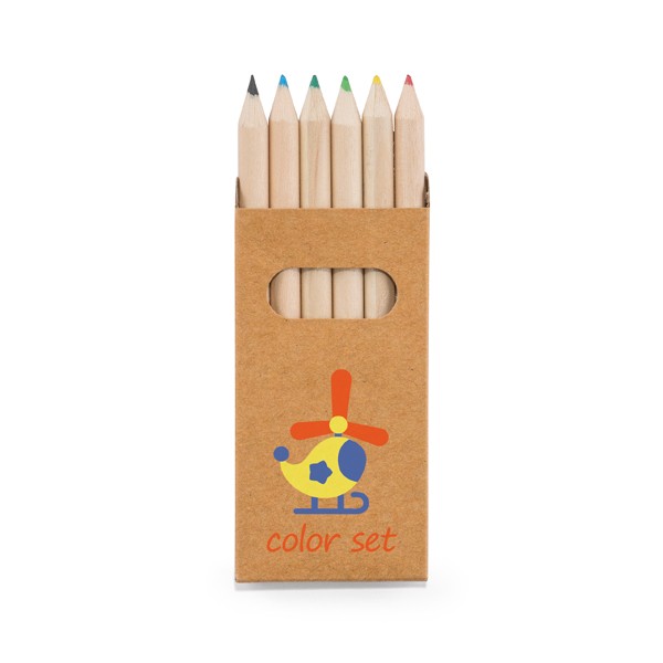 Boîte en carton avec 6 crayons de couleur pour coloriage. Fabriqué en Chine.