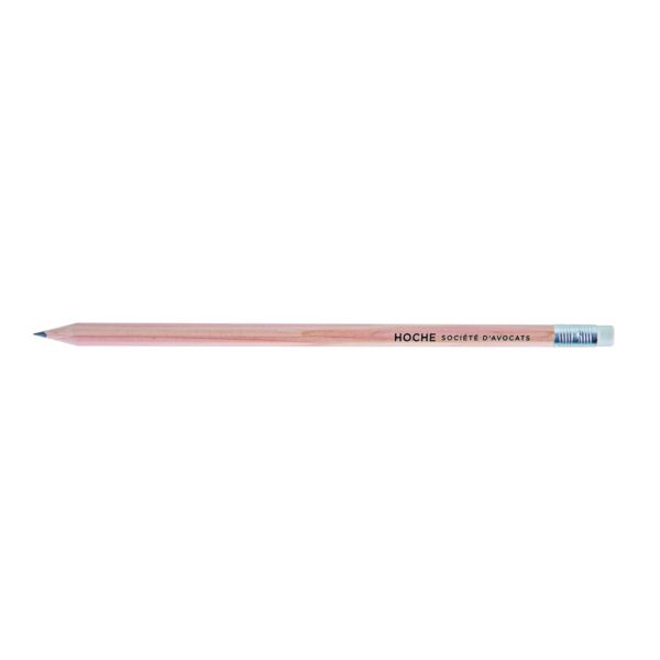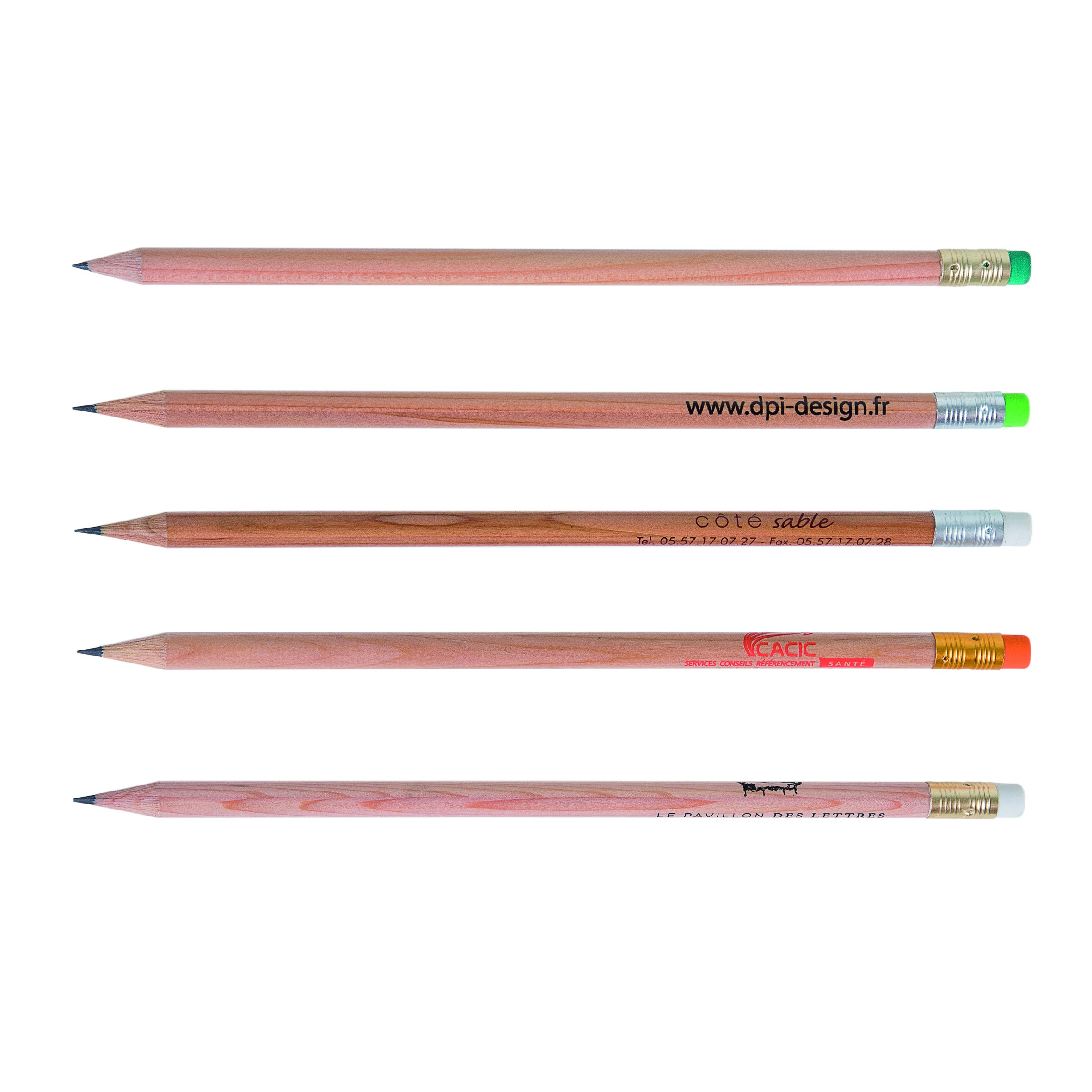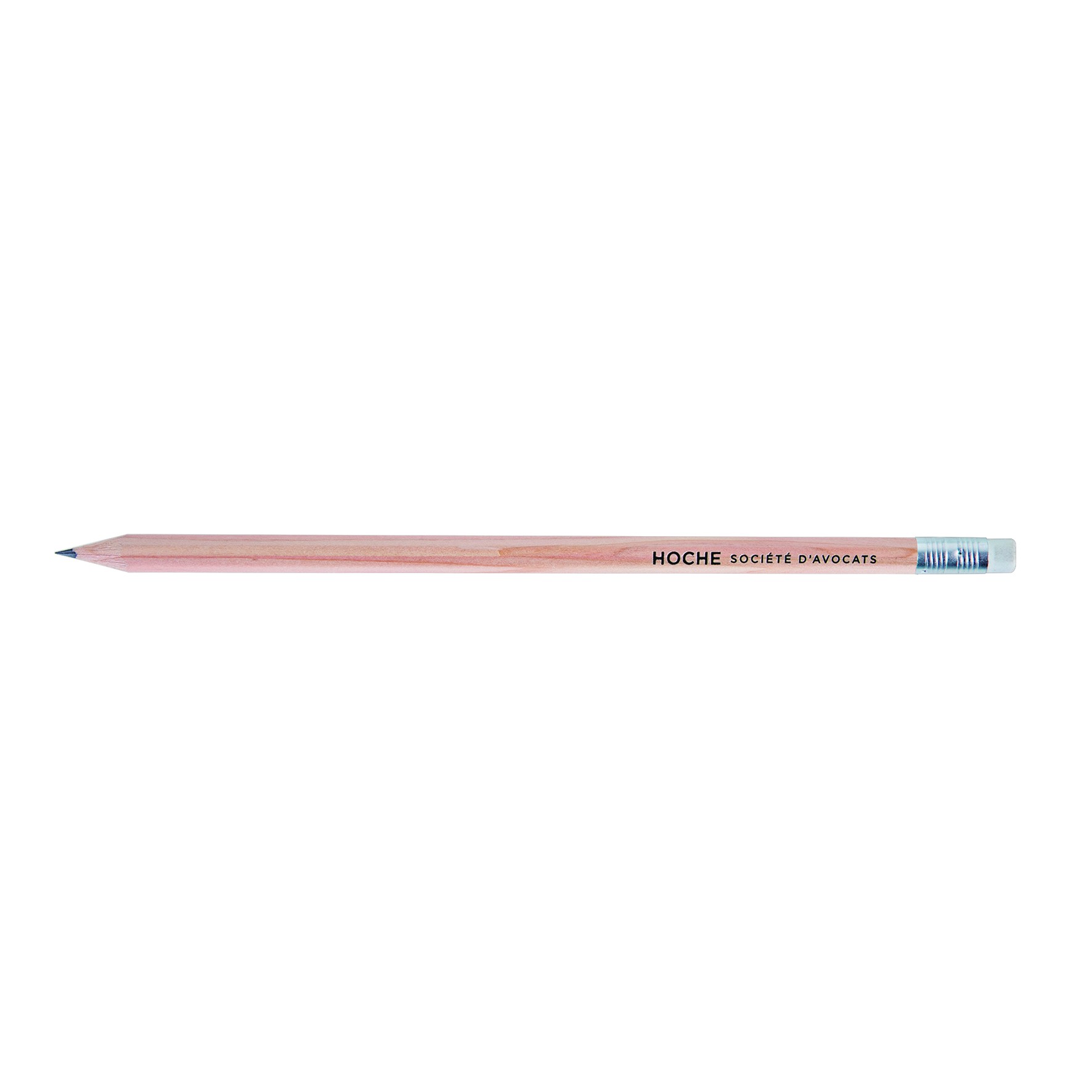 Crayon de papier avec vernis incolore et tête gomme. Fabriqué en France. Un marquage à chaud 1 couleur 1 position et frais techniques inclus.