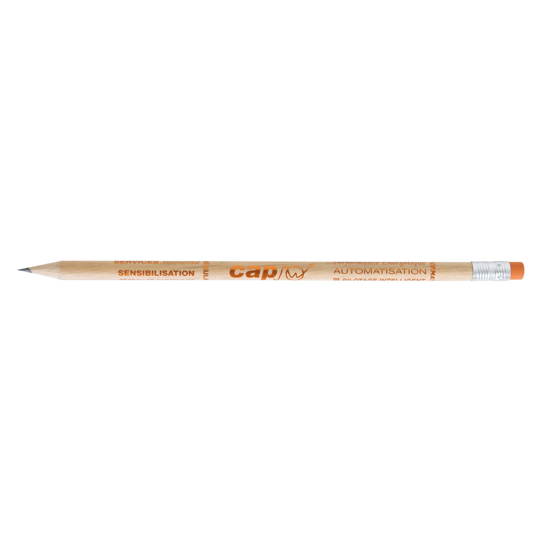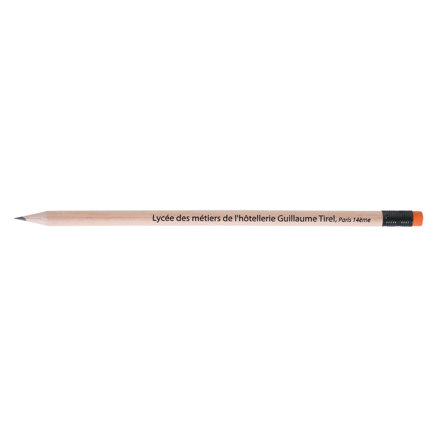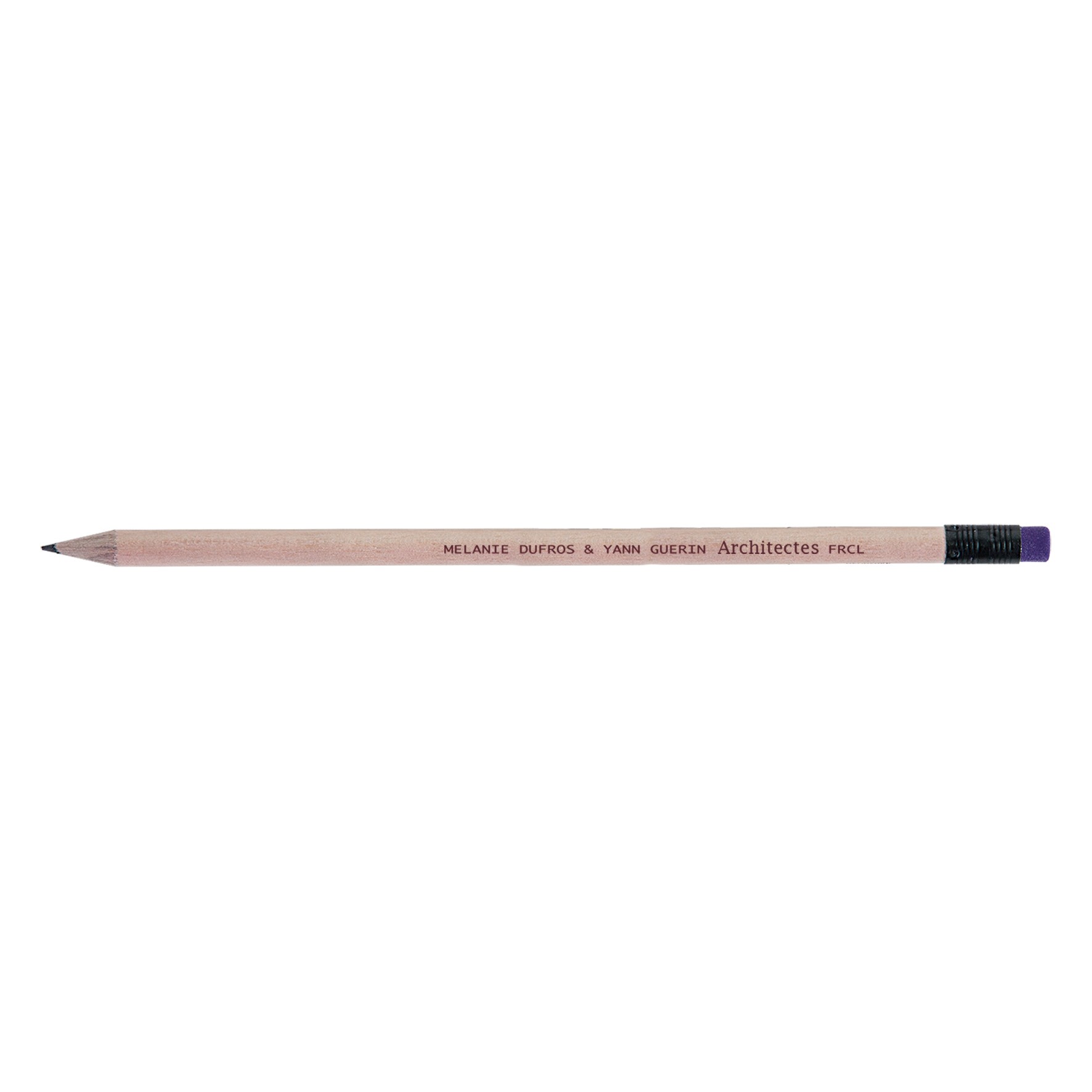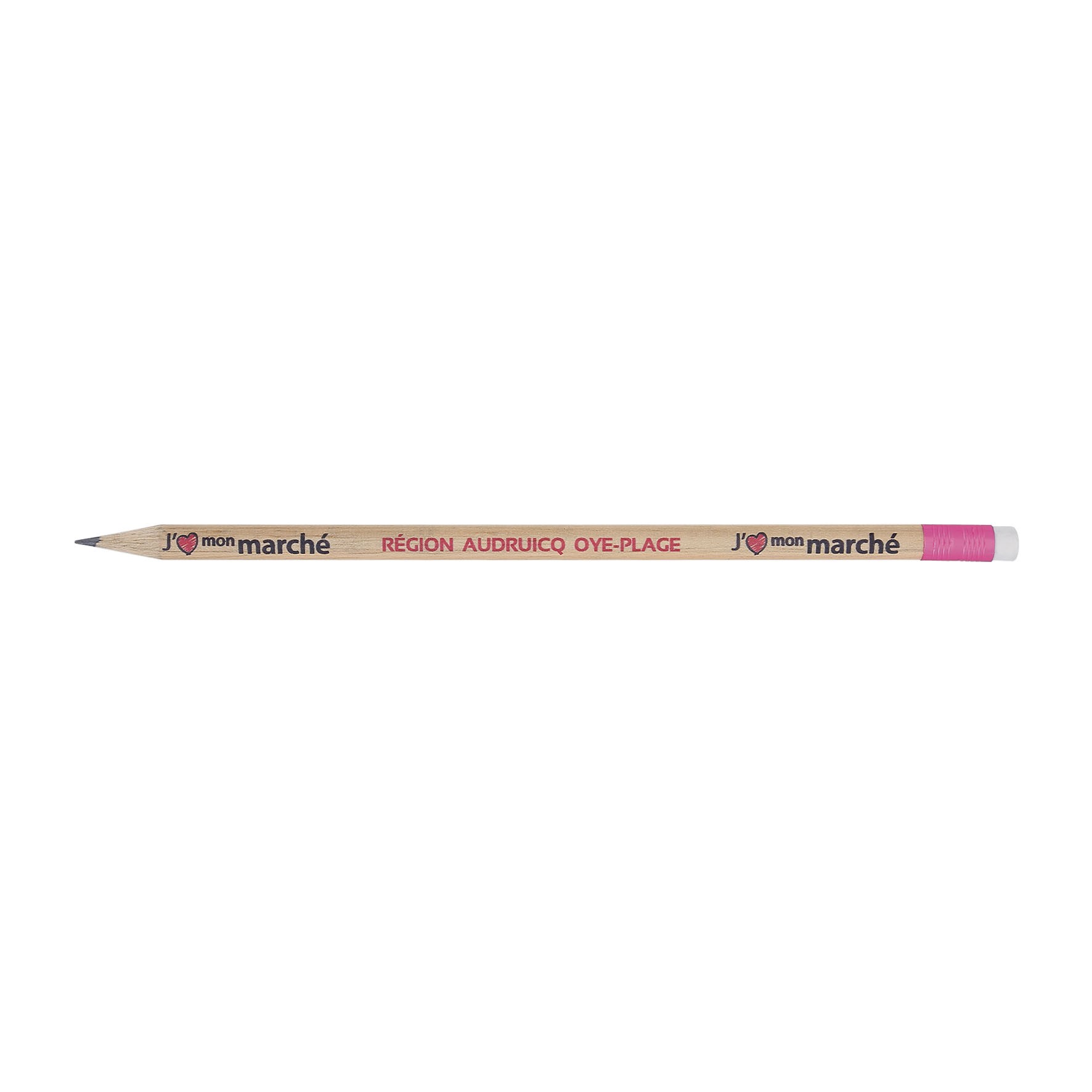 Crayon en bois du Pelay avec tête gomme et vernis incolore, choix de coloris de la gomme et de la virole. Un marquage 1 couleur à chaud 360° et frais techniques inclus.