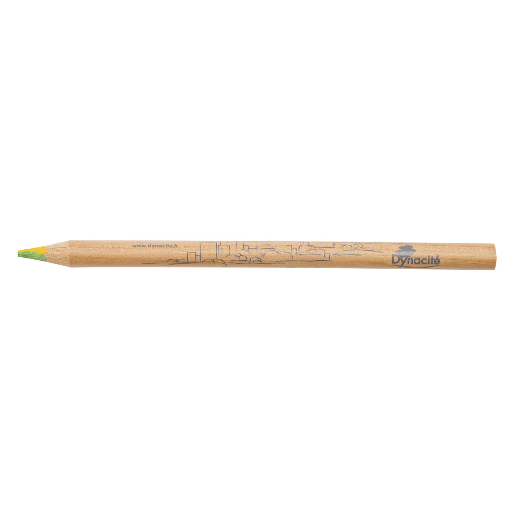Crayon rond à tête coupée avec vernis incolore et mine 4 couleurs : bleu, rouge, jaune et vert. Un marquage à chaud 1 couleur 360° et frais techniques inclus