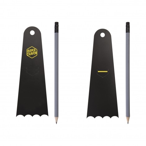 Crayon ECO hexagonal vernis gris mat 430C, tête gomme et virole noire. Cape noire et jaune en cartonnette 250 gr/m. Un marquage à chaud sur le crayon en jaune inclus (pantone 115C – hors frais techniques) (nous consulter pour le marquage sur cape).