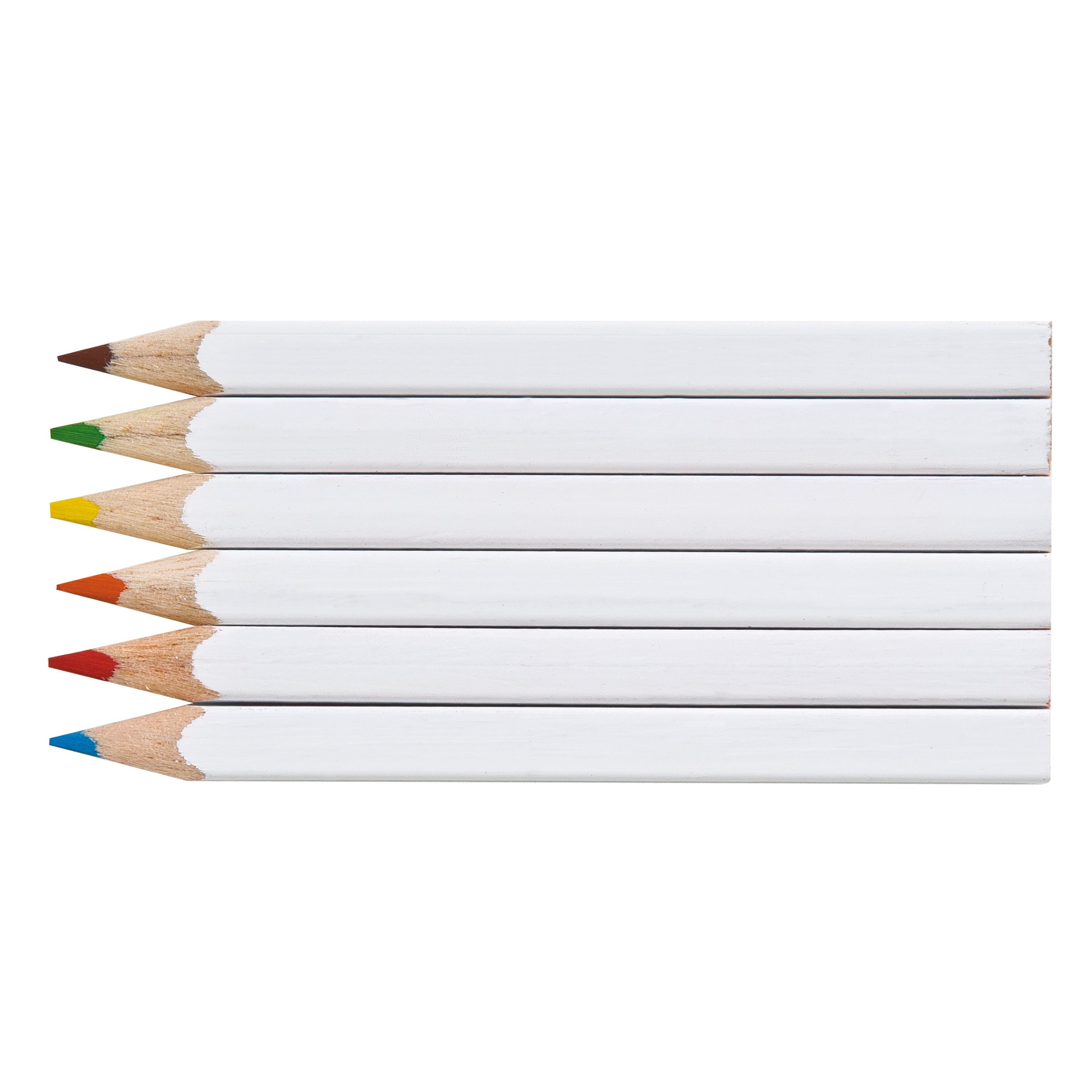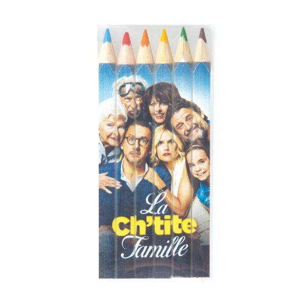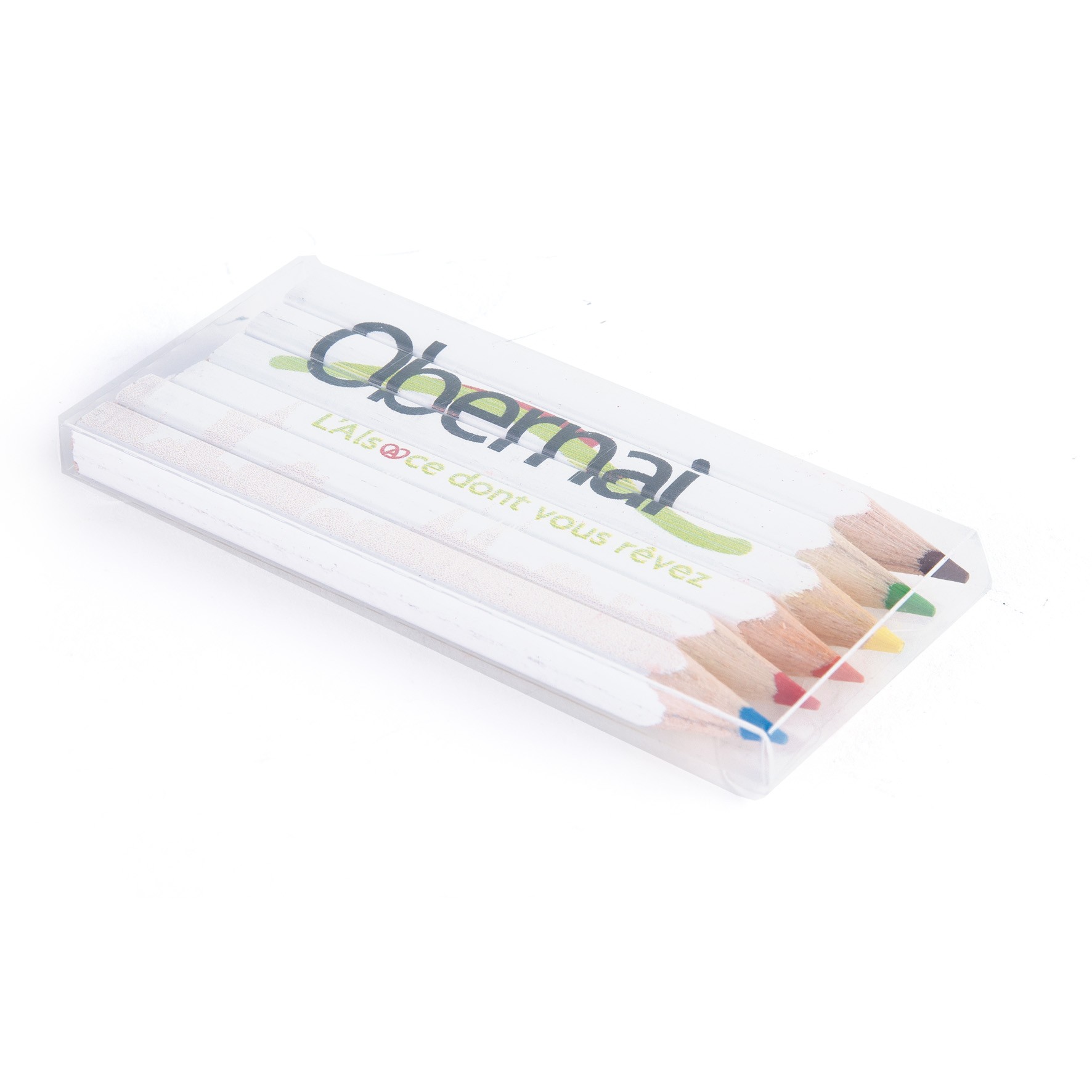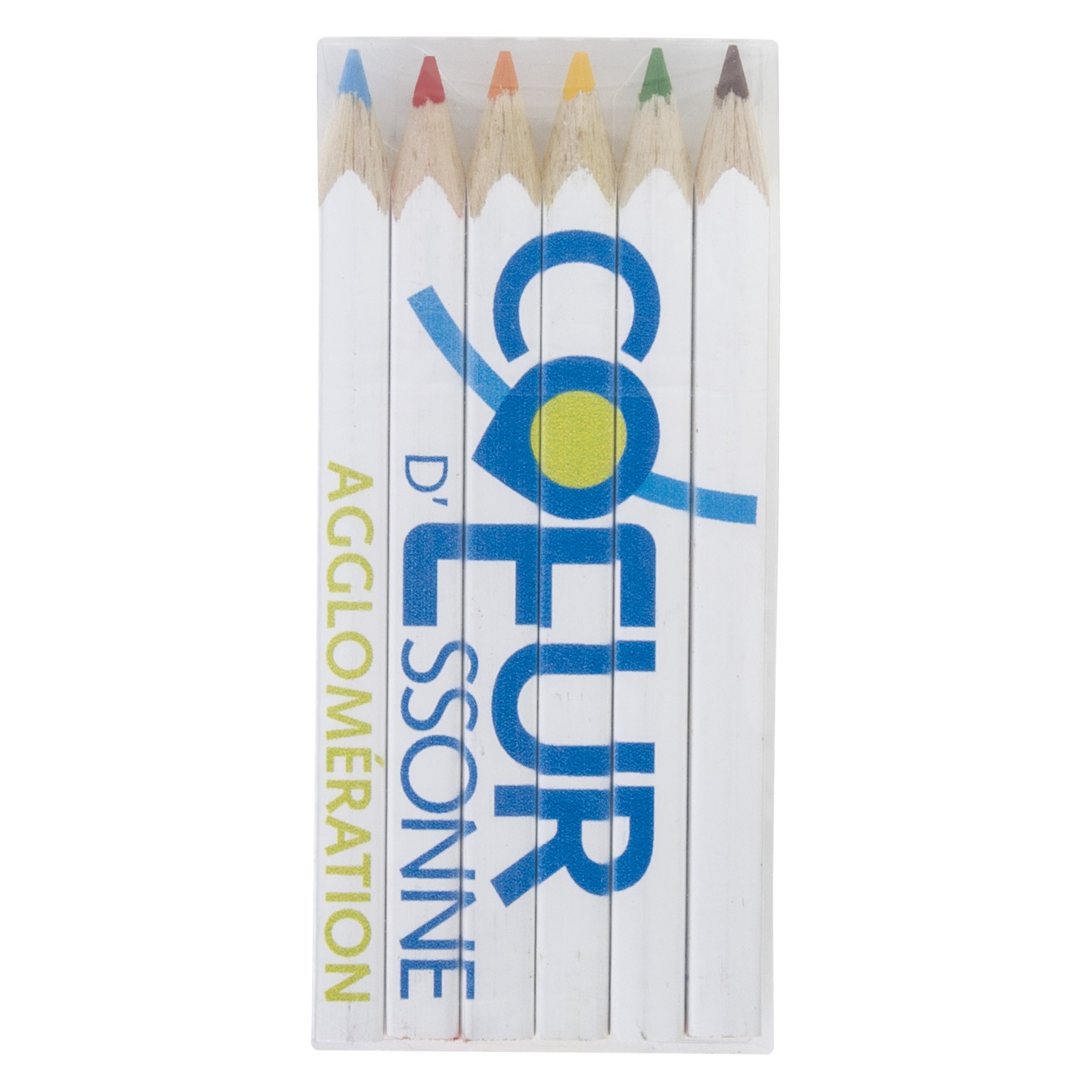 Set de 6 crayons de couleurs eco, tête coupée, vernis blanc dans un étui polypro transparent. Un marquage quadri 1 face et frais techniques inclus.