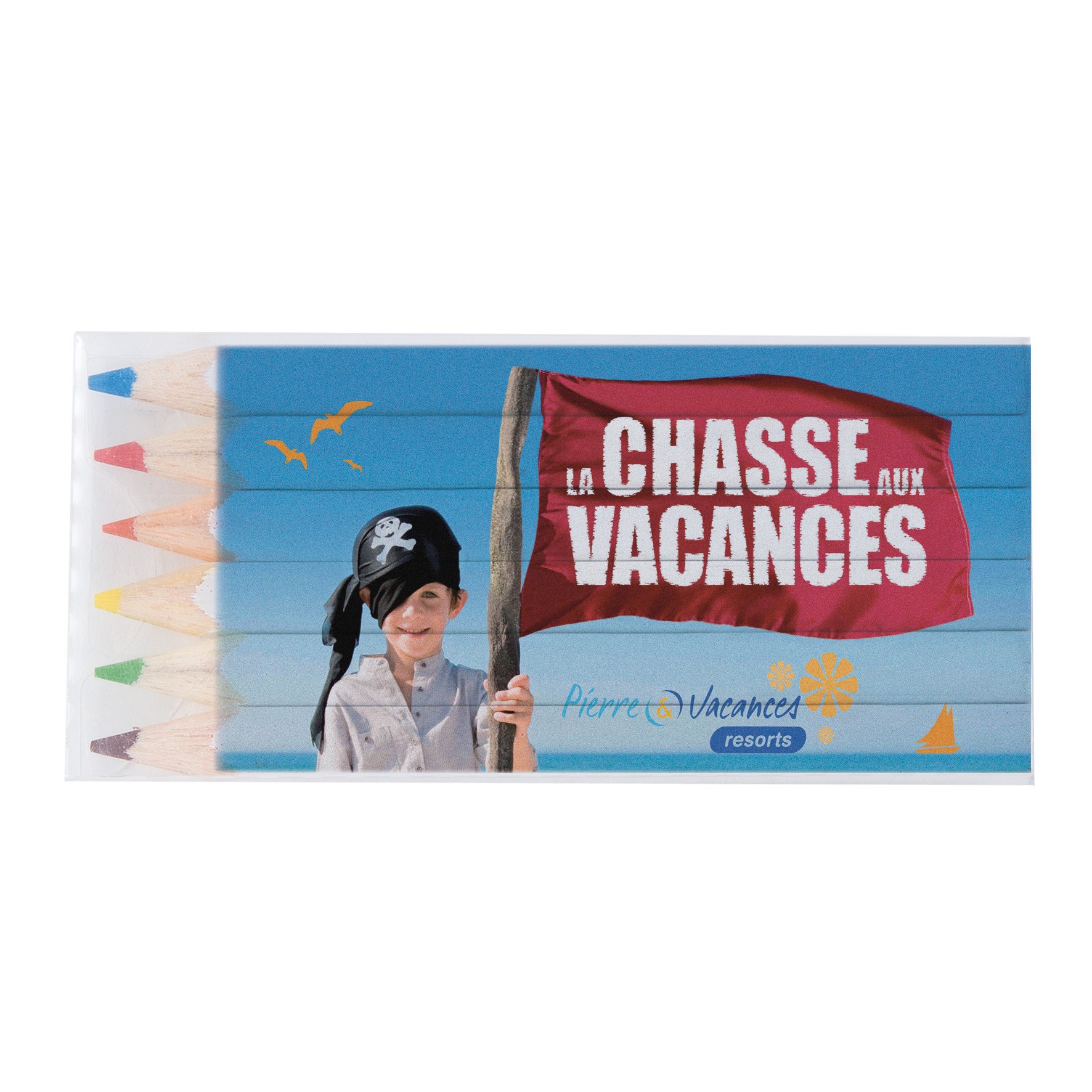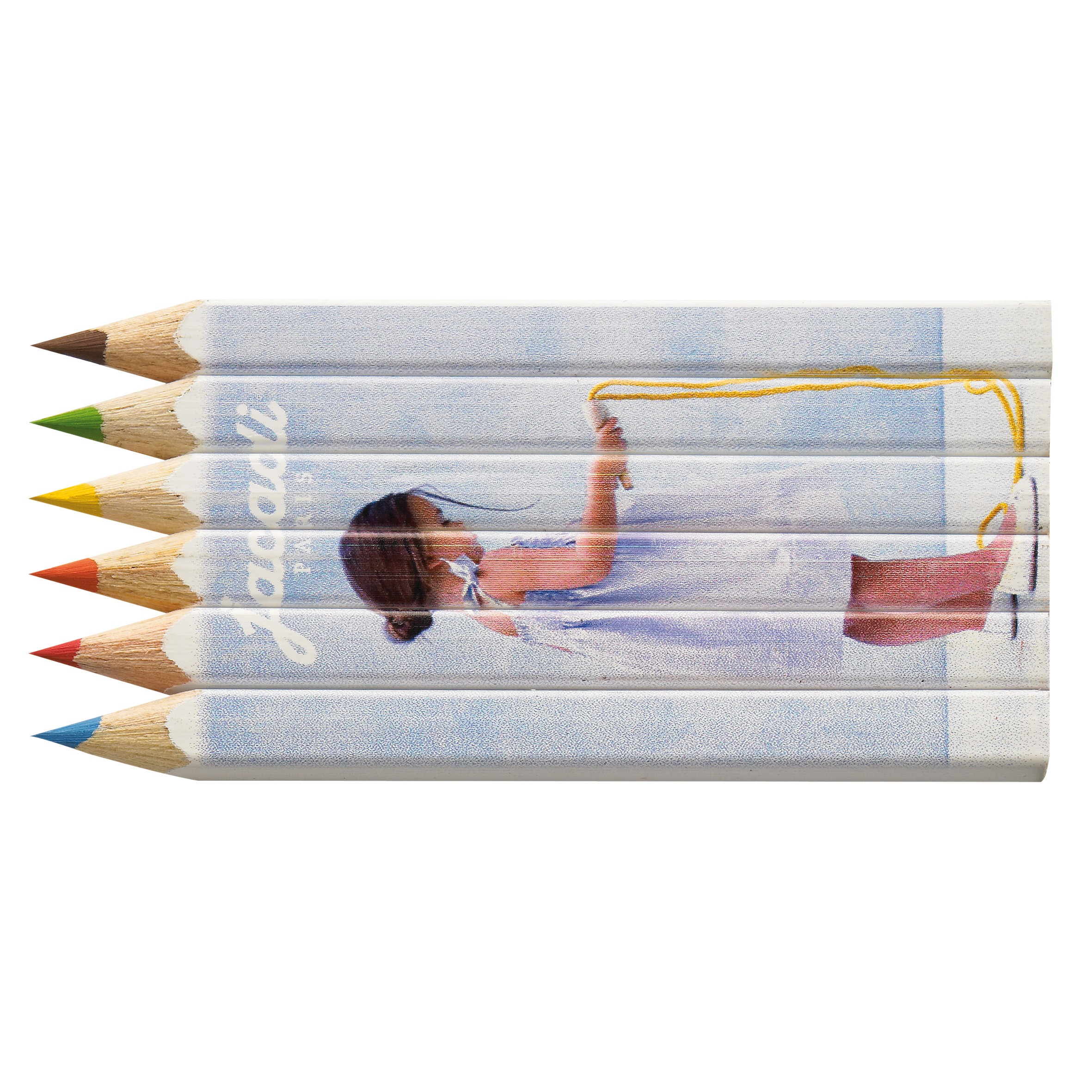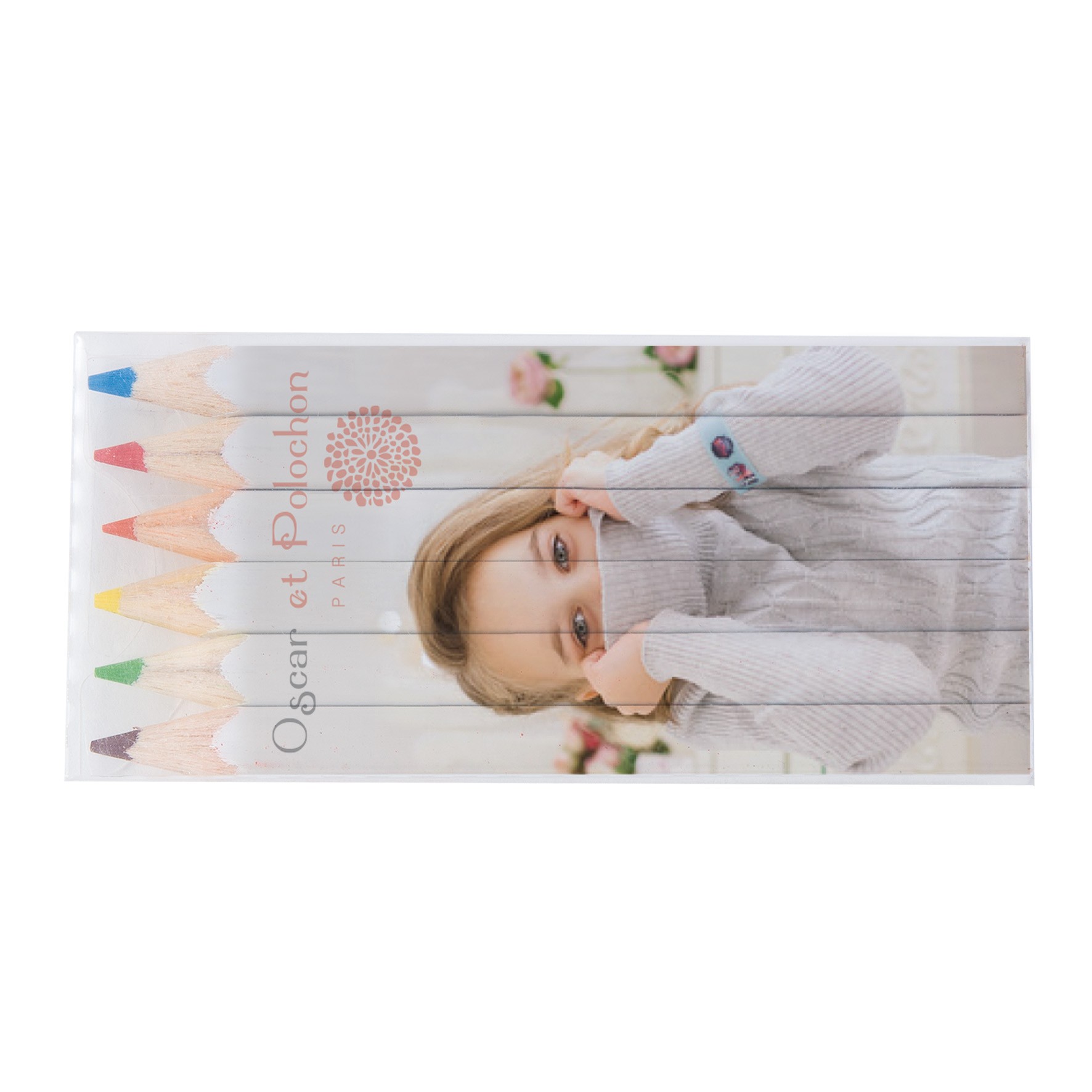 Set de 6 crayons de couleurs eco, tête coupée, vernis blanc dans un étui polypro transparent. Un marquage quadri 1 face et frais techniques inclus.