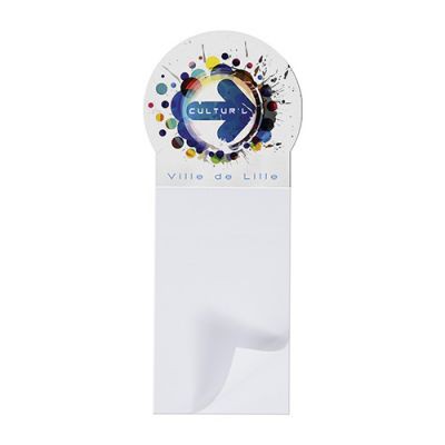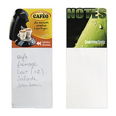 Bloc en PVC magnétique blanc avec bloc de 25 feuilles repositionnables blanches ou recyclées de 6*10 cm. Un marquage quadri et frais techniques inclus.