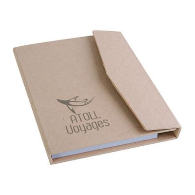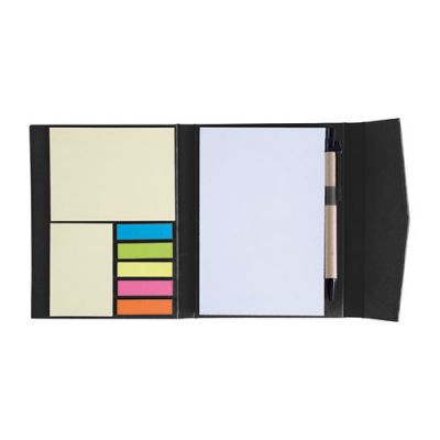 Blocs adhésifs format A6 en carton recyclé, 75 feuilles blanches, 25 feuilles adhésives jaunes A7, 25 feuilles adhésives jaunes A8, 125 marques-pages adhésifs (25/couleur) et stylo bille encre noire. fabriqué en Chine.