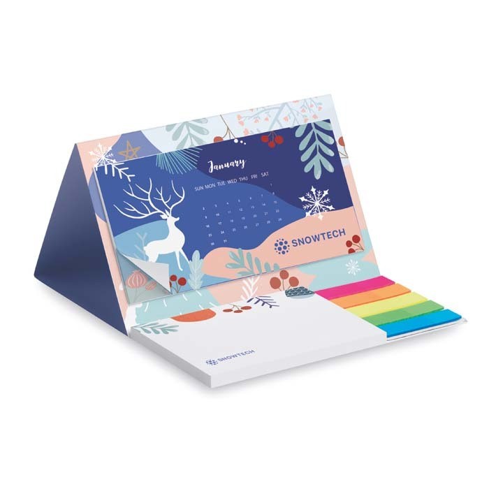Calendrier en papier à couverture souple avec 12 feuilles de calendrier avec votre motif, 50 notes autocollantes et 20 marqueurs en 5 couleurs. Créez votre propre design pour la couverture et les 12 feuilles du calendrier. Vous pouvez également choisir d’ajouter des pages supplémentaires avec le message de votre entreprise et d’ajouter votre logo sur chaque note autocollante. Fabriqué en Europe. Un marquage quadri sur la couverture extérieure + un marquage 2 couleur 1 face sur les repositionnables et frais techniques inclus.