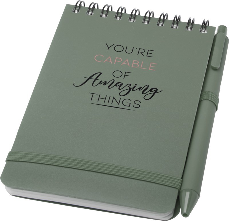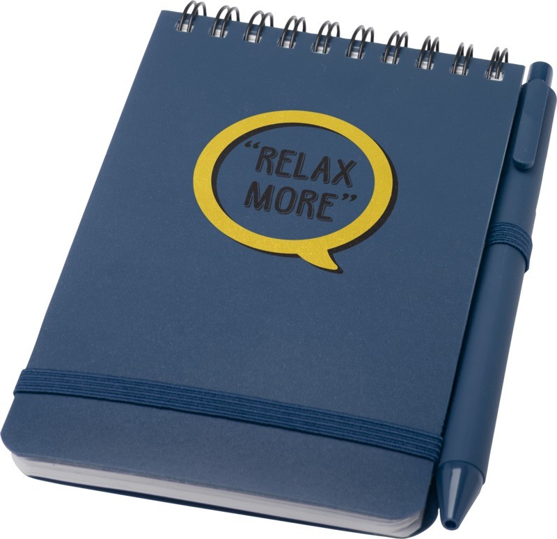 Le carnet à couverture rigide Thalaasa A6 est fabriqué en plastique océanique recyclé et contient 80 feuilles lignées de papier crème de 70 g/m². Il comporte des coins arrondis, une fermeture élastique et une boucle pour stylo. Le stylo bille à encre noire est également fabriqué à partir de plastique océanique recyclé. Longueur d’écriture : 1000 mètres. Taille de la plume : 1,0 mm. Fabriqué en Chine avec du papier certifié FSC et plastique recyclé.