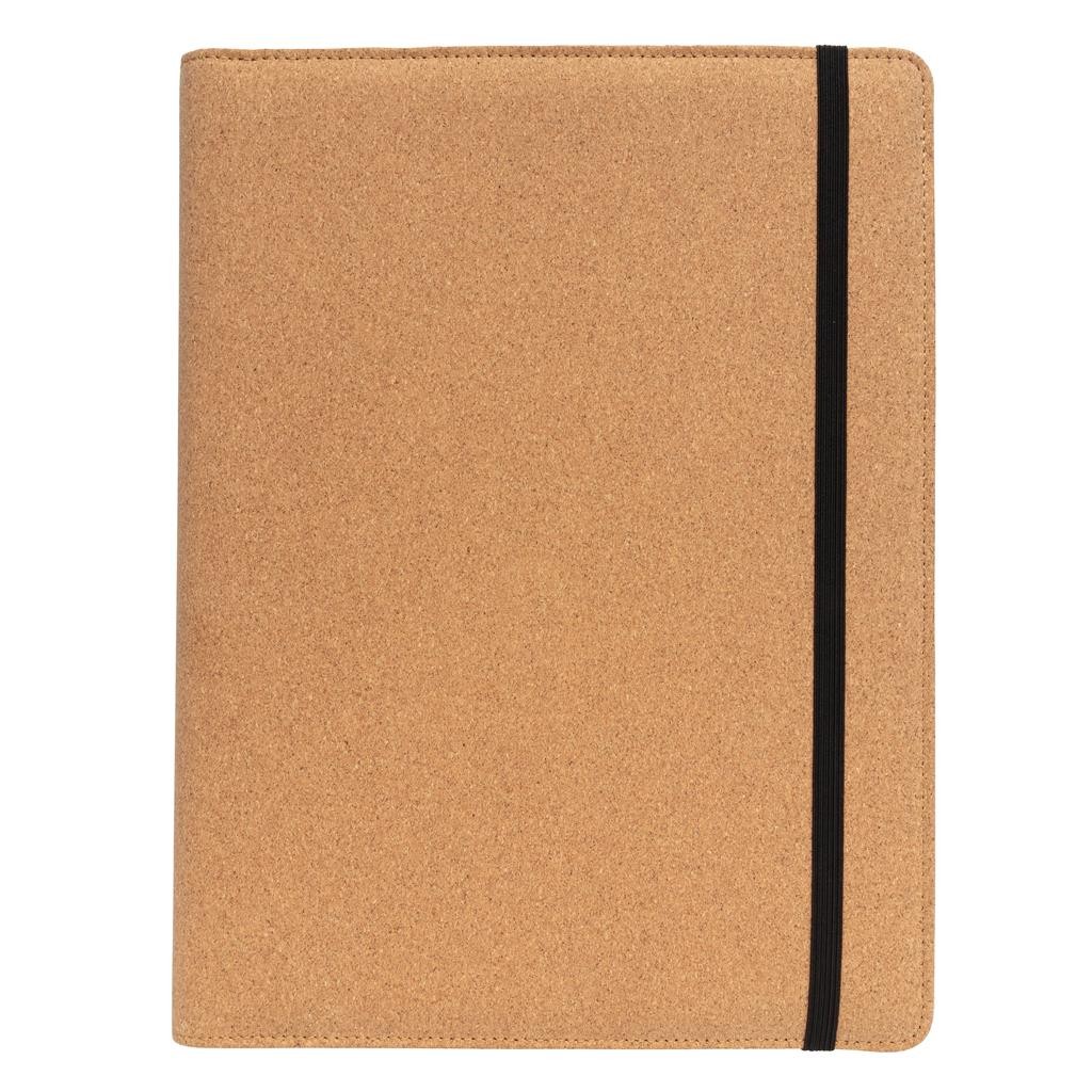 Conférencier A4 en liège avec détails noirs et à l’intérieur un bloc-notes de 20 feuilles de papier recyclé ligné 80gm/s de couleur crème, 1 grande poche, 1 poche pour téléphone, 2 poches supplémentaires, 4 emplacements pour cartes, un porte stylo et un stylo assorti en liège et en paille de blé. Fermeture par élastique. Livré dans une boîte cadeau en kraft.