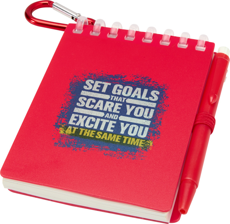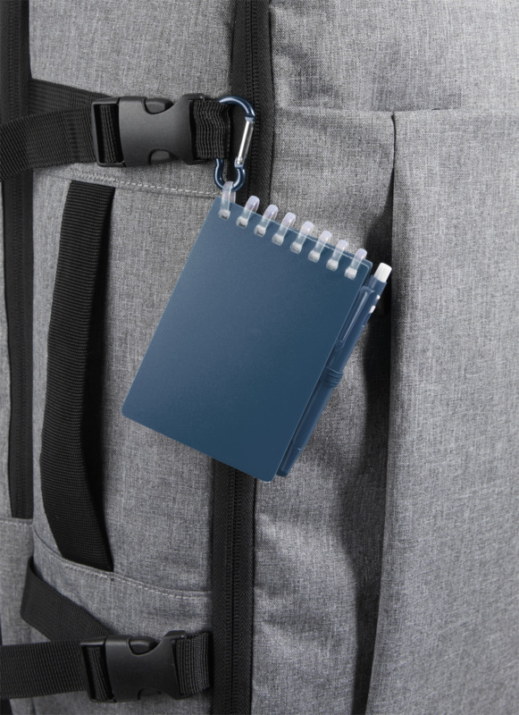 Le kit Lig composé d’un mini carnet et d’un stylo est un compagnon compact et pratique pour la prise de notes en déplacement. Le carnet à spirales est doté d’une couverture en plastique recyclé souple et de 70 feuilles vierges en papier de pierre résistant à l’eau de 120 g/m², ce qui le rend idéal pour une utilisation en extérieur. Avec ses coins arrondis et sa boucle pour stylo intégrée, il s’inscrit dans la tendance des mini cahiers tout en restant fonctionnel. Le stylo à bille assorti est fabriqué en plastique ABS recyclé, utilise de l’encre noire et offre une longueur d’écriture de 250 mètres. Un anneau métallique de couleur assortie permet d’attacher facilement le kit à un sac à dos, un sac à main ou un porte-clés, ce qui le rend idéal pour des prises de notes partout et en tous temps. Fabriqué en Chine et imprimé en Europe.