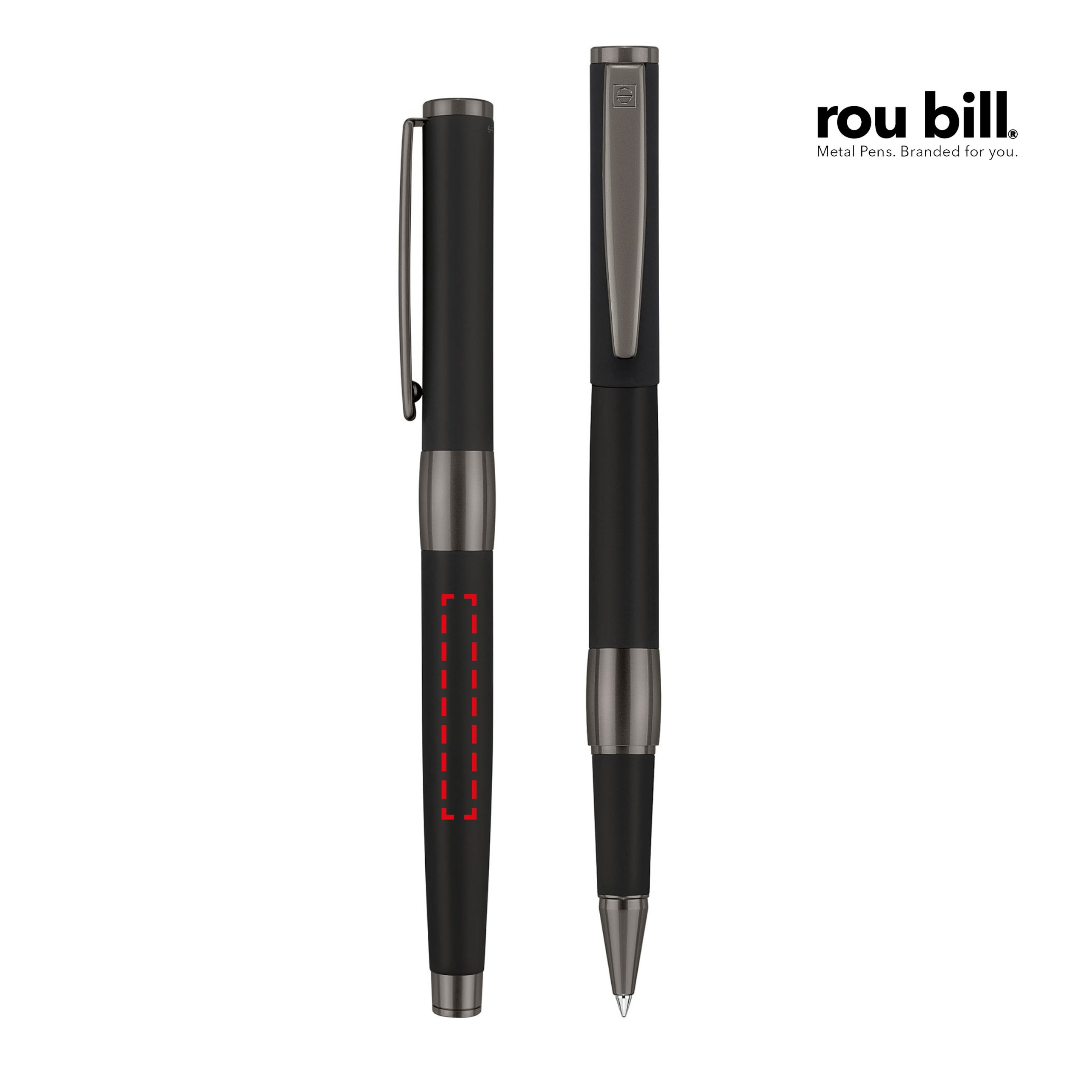 Rollerball avec corps en métal laqué, toucher doux, attributs en métal gun metal et recharge sécurité en métal pour roller avec couleur d’encre bleue. Fabriqué en Chine. Une gravure laser et frais techniques inclus.