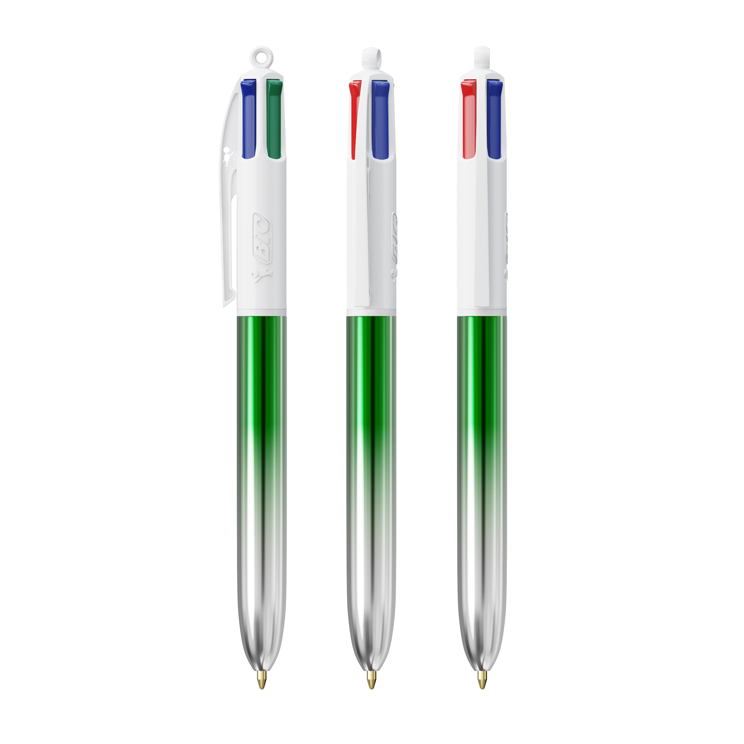 Découvrez notre nouveau BIC® 4 Couleurs® Bicolor ! Son effet métallique brillant unique combine 2 couleurs brillantes sur le corps, pour les designs les plus créatifs et un look métallique avec une touche artistique ! Nos stylos à bille BIC® 4 Couleurs® ont une longueur d’écriture moyenne de 8 000 m (tests SGS – longueur d’écriture moyenne pour les cartouches bleue, noire, rouge et verte). Notre emblématique BIC® 4 Couleurs® devient plus durable, avec désormais 13 % de plastique en moins dans la partie supérieure ! Un marquage 1 couleur 1 position et frais techniques inclus