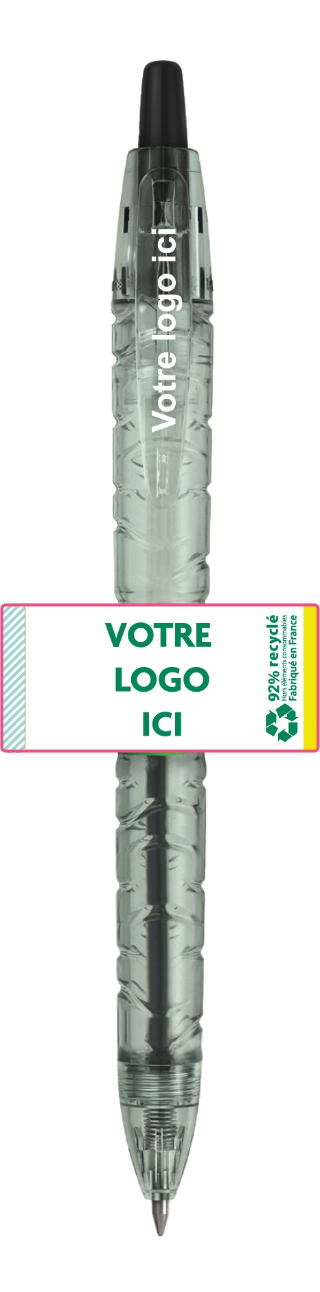 Stylo bille issu de plastiques de bouteilles d’eau recyclées et des déchets plastiques récoltés sur les plages d’ou la forme originale inspiré d’une bouteille d’eau. 92% de plastique recyclé et rechargeable. Une visibilité optimale de votre logo associé à un concept éco-responsable et fabriqué en France dans une usine certifiée EMAS et ISO 14001. Un marquage 1 couleur sur clip et frais techniques inclus.