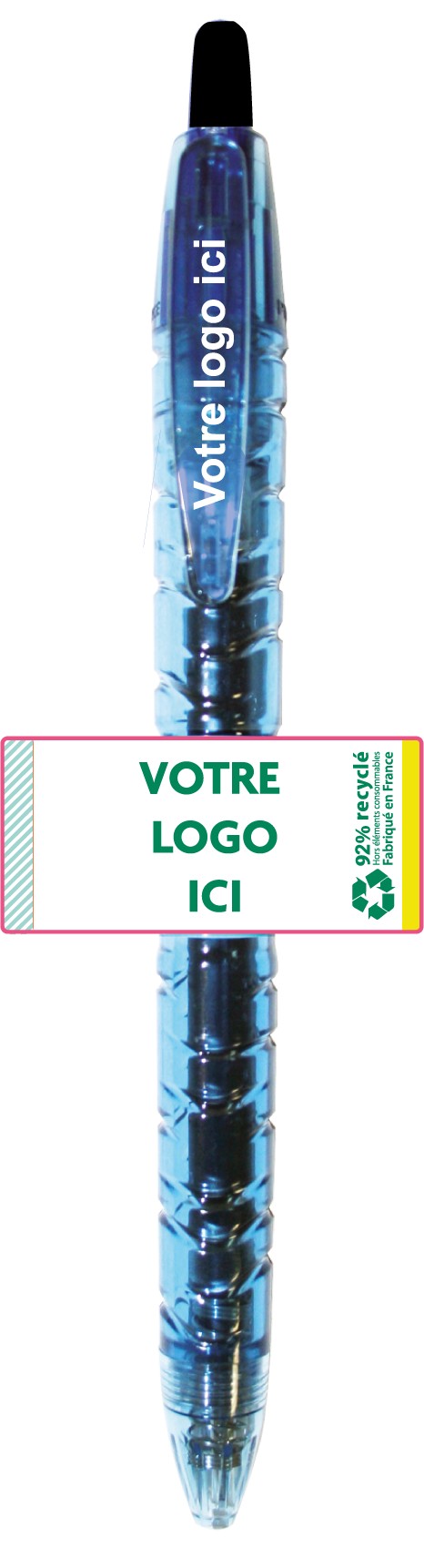 Roller avec encre gel écologique issu de plastiques de bouteilles d’eau recyclées et des déchets plastiques récoltés sur les plages d’ou la forme originale inspiré d’une bouteille d’eau. 92% de plastique recyclé et rechargeable. Une visibilité optimale de votre logo associé à un concept éco-responsable et fabriqué en France dans une usine certifiée EMAS et ISO 14001. Un marquage 1 couleur sur clip et frais techniques inclus.