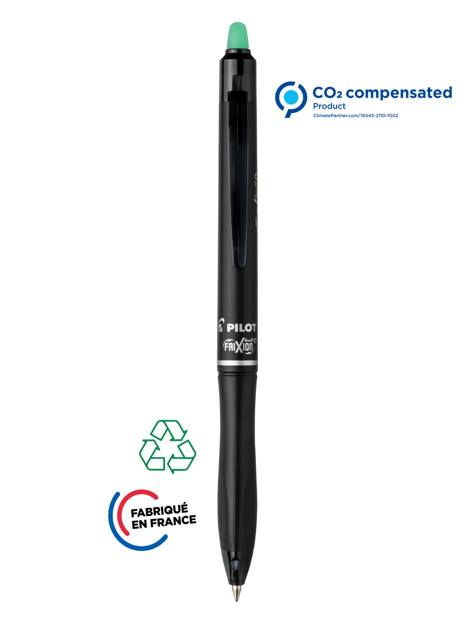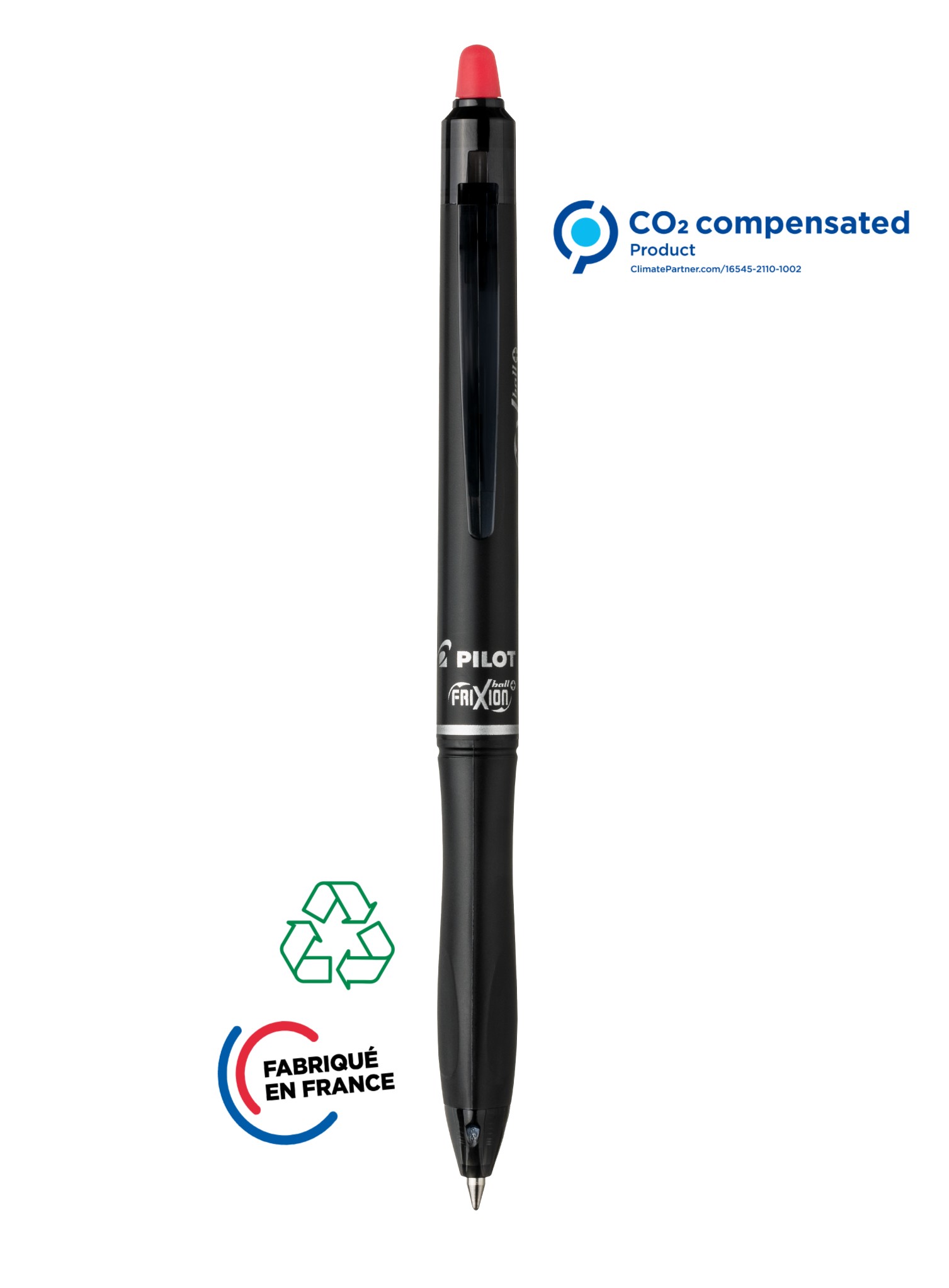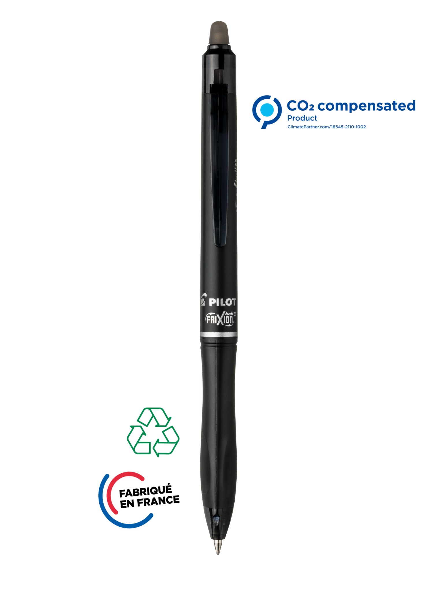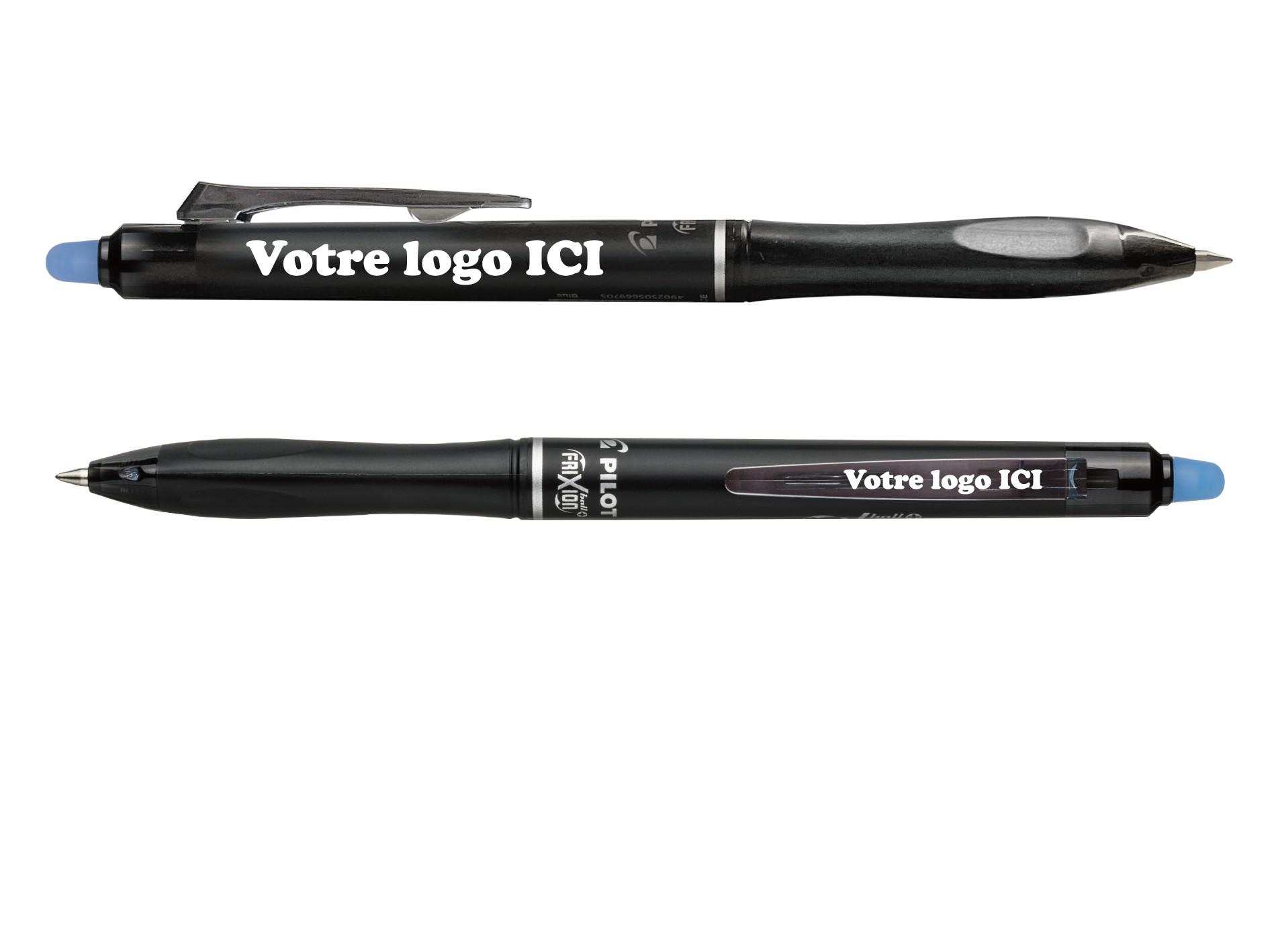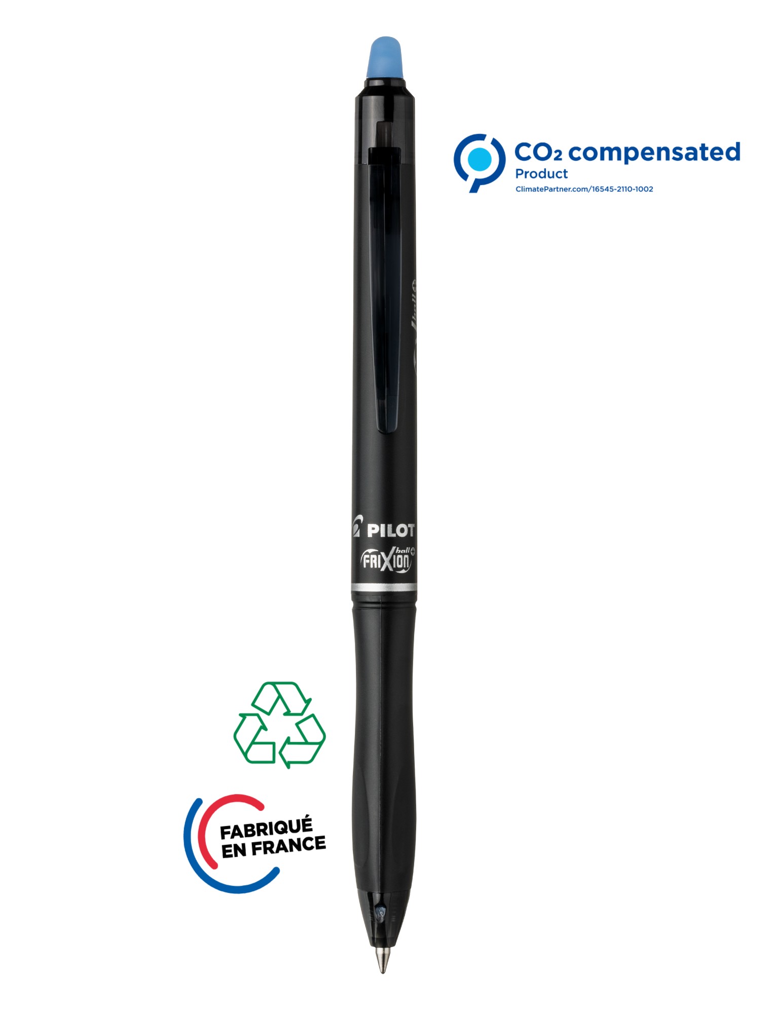 Surprenez vos clients avec la technologie Pilot FRIXION, écrivez, effacez et recommencez autant de fois que vous le souhaitez. 4 couleurs d’encres : bleu, noir, rouge, vert, developpé et fabriqué en France. En integrant 82% de plastique recyclé, l’empreinte carbone du Frixion Ball a été réduite de 36%. Cette encre gel thermosensible s’efface totalement grace au frottement sur le tracé. Cette action peut-etre répétée à l’infini. Quelques minutes dans un endroit très froid peut faire réapparaitre le tracé effacé. Un marquage 1 couleur 1 position et frais techniques inclus.