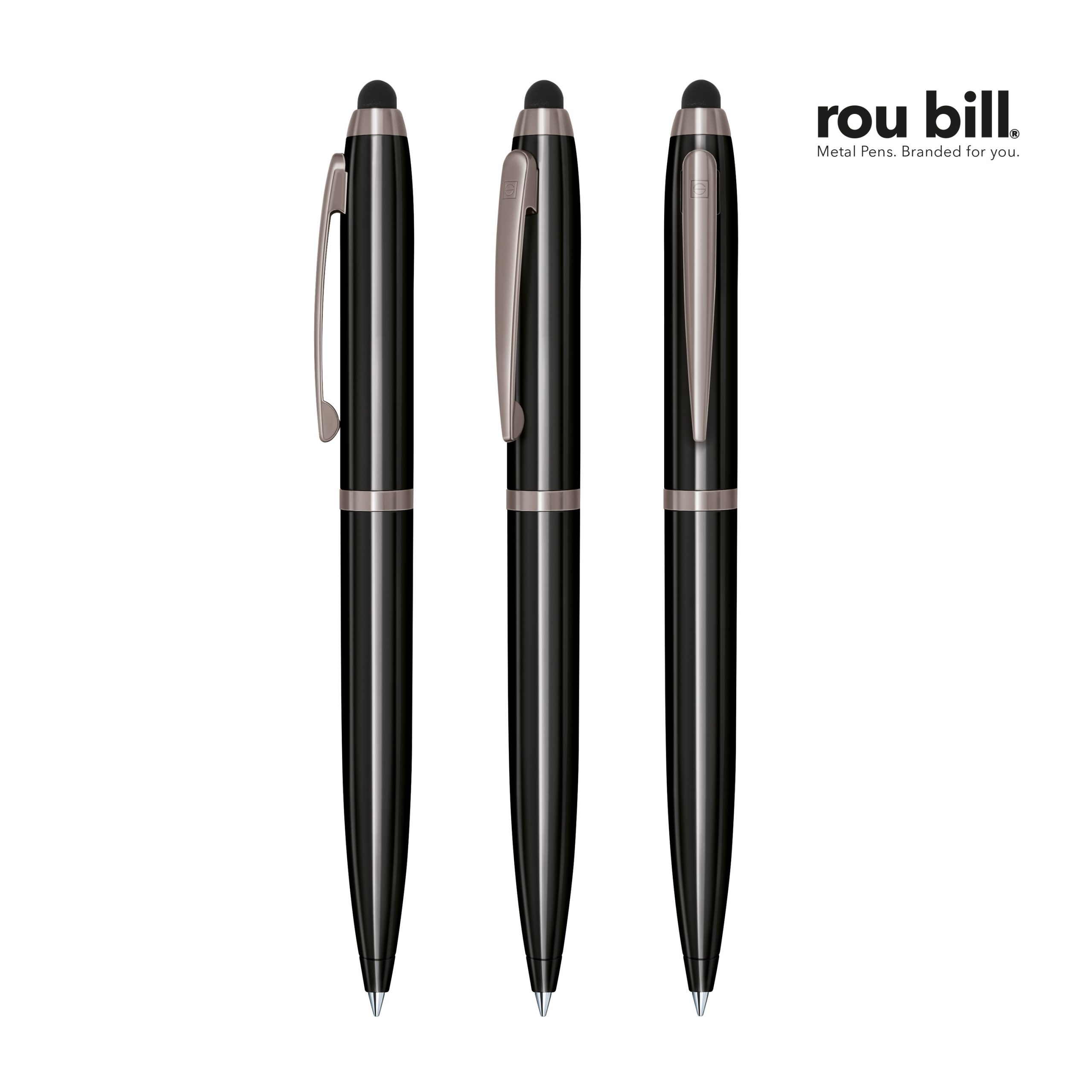 Stylo à bille à mécanisme tournant avec pointe touch pad. Corps en métal laqué brillant, attributs en métal gun metal et recharge senator® métal, G2 avec longueur d’écriture jusqu’à 8 500 m et encre bleue. Fabriqué en Chine. Un marquage 1 couleur 1 position et frais techniques inclus.