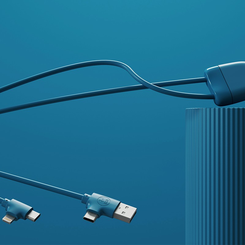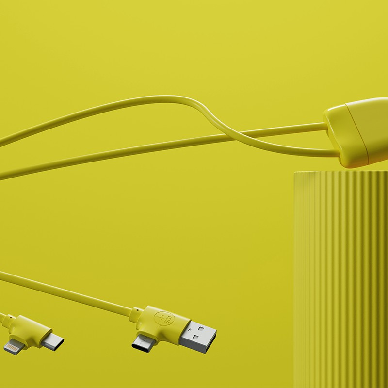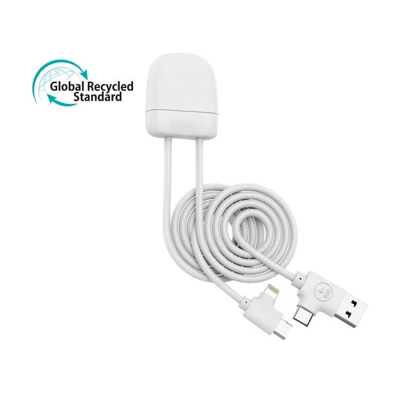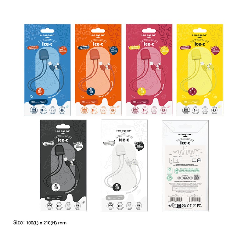 Grâce à sa double entrée USB-C et USB, vous pourrez recharger vos appareils à la maison, au bureau ou en déplacement, les synchroniser à vos appareils ou les connecter à votre voiture ! Ice-c you soon ! Ce câble multi-connecteurs coloré qui vous fera fondre à coup sur est développé dans une démarche de progrès. 55% de plastique recyclé certifié GRS. Double soortie USB-C et lightning et fonction carplay. Packaging en papier certifié FSC issu d’une exploitation forstière disposant d’une gestion durable.