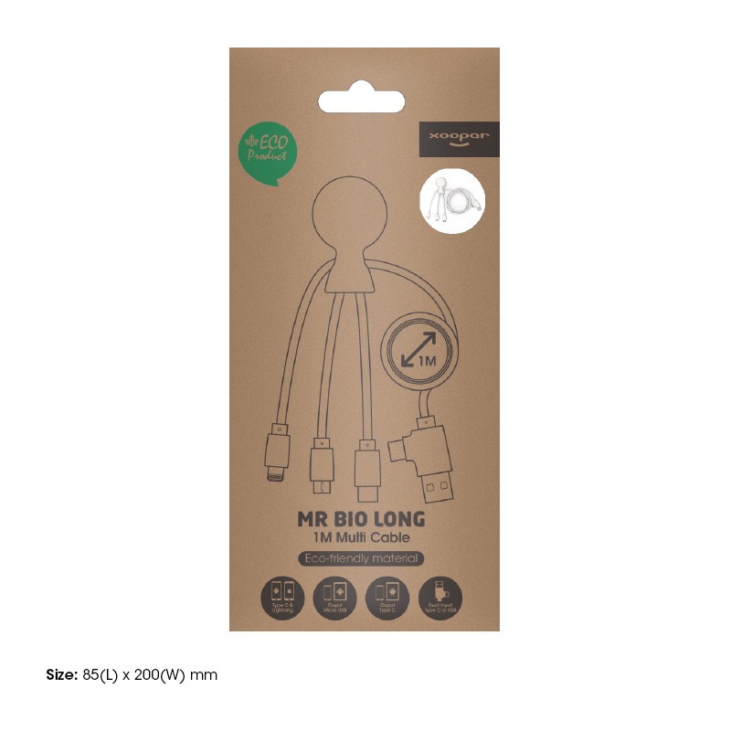 Nos câbles en plastique recyclé certifiés GRS – 49% RTPE + 12% RABS + Plastique recyclé injecté avec 61% de PC recyclé GRS certifié . Du smartphone aux écouteurs sans fil en passant par la cigarette électronique, Mr Bio Long permet d’utiliser tous vos appareils où que vous soyez tout en faisant le plein de batterie ! Facilement transportable, il ne quittera plus votre sac ! Avec son bras d’un mètre de longueur, c’est l’accessoire indispensable afin de faire le plein de batterie à tout moment de la journée ! Entrée : USB-C et USB, sortie : lightning + USB-C + Micro-USB. Compatible avec tout type d’appareils (smartphone, écouteur sans fil, GoPro,..). Packaging en papier certifié FSC issu d’une exploitation forestière, disposant d’une gestion durable. Fabriqué en Chine.