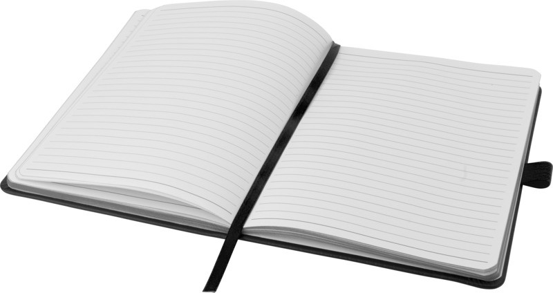 Carnet de notes A5 en PU de papier beige ligné (80 feuilles). Possède un signet et un élastique de fermeture. Produit certifié FSC et fabriqué en Chine.