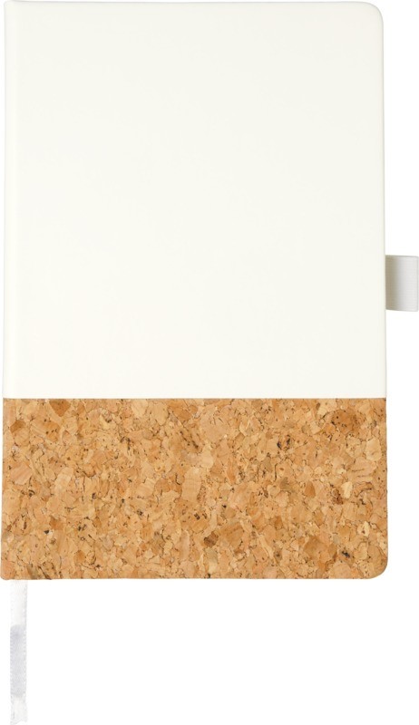 Carnet de notes à couverture rigide de taille A5 en liège avec partie inférieure en PU. Fermeture élastique de couleur assortie, marque-page ruban, papier ligné crème de 80 feuilles (80 g/m²) et poche extensible au dos pour garder de petites notes. Présentation dans un coffret noir. Ce produit est certifié FSC et fabriqué en Chine.