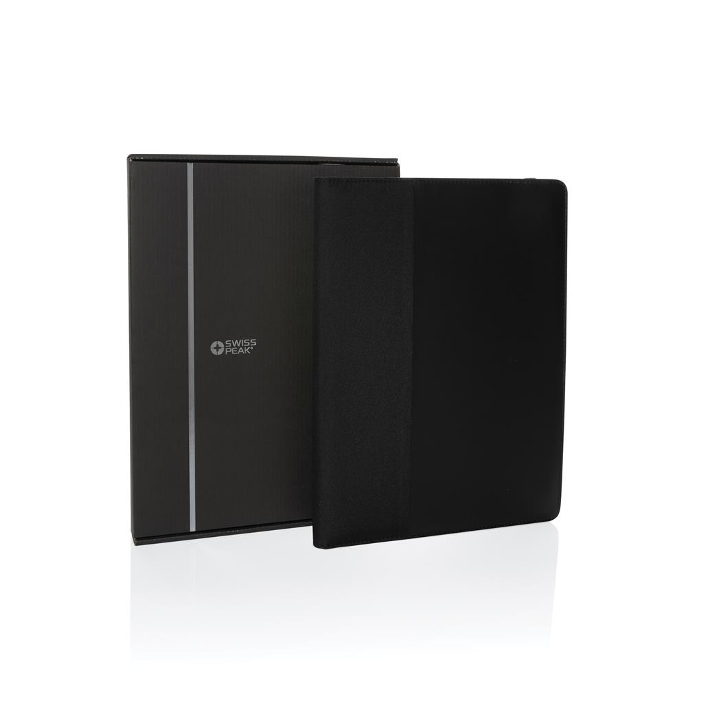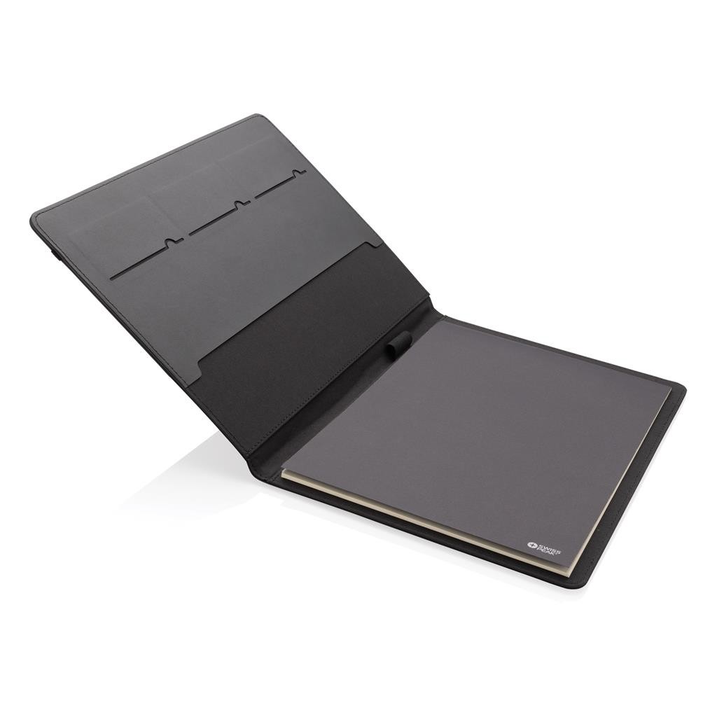 Porte-documents fabriqué en polyester recyclé AWARE 300D et en PU recyclé certifié RCS, allie style et faible impact. Il comporte des fentes pour cartes de visite, un passant stylo et une pochette A4 spacieuse. Restez organisé grâce au bloc-notes A4 ligné rechargeable (20 pages 70 g/m²) fabriqué à partir de papier crème FSC® mix. Fabriqué à partir de polyester 100 % recyclé avec le traceur AWARE™. Emballé dans une boîte cadeau FSC®.