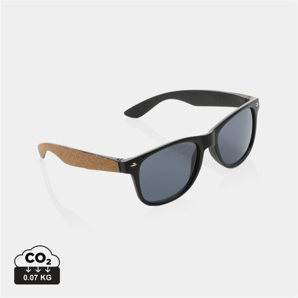 Lunettes de soleil avec monture en PC recyclé certifié GRS. Le matériau de la monture est 100 % recyclé. Contenu recyclé total : 68 % basé sur le poids total de l’article. La certification GRS garantit une chaîne d’approvisionnement entièrement certifiée des matériaux recyclés. Avec détail en liège FSC® sur les branches extérieures. Les lentilles sont en acrylique fumé et conformes à la norme EN ISO 12312-1, UV 400 et CAT 3. Livrées dans un emballage kraft FSC®.